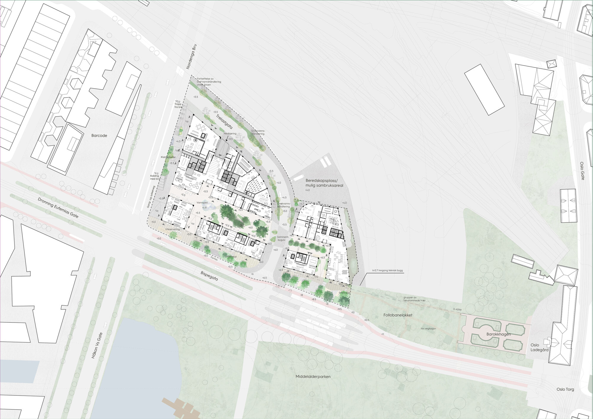 Det er tenkt et sambruk mellom publikumsfunksjonene på bakkeplan og kontorfunksjonene i resten av bebyggelsen. Langs Bispegata er det tilrettelagt for et bredt tilbud av kultur, forretning og serveringsteder. Serveringsstedene vil ha områder for uteservering i sol og kontakt med Middelalderparken.