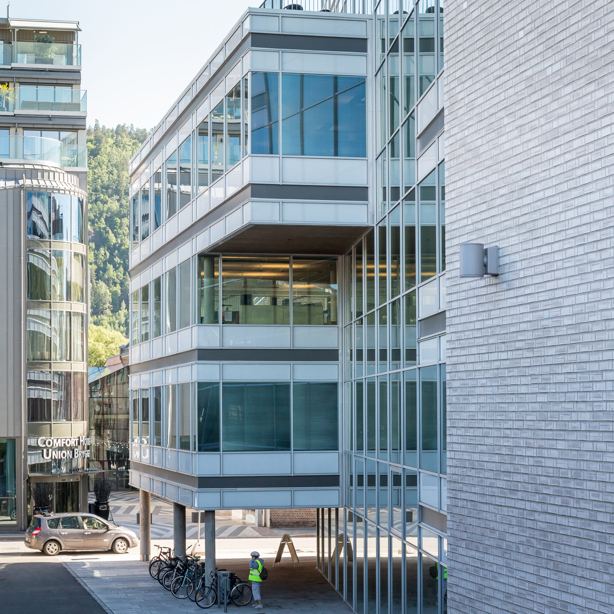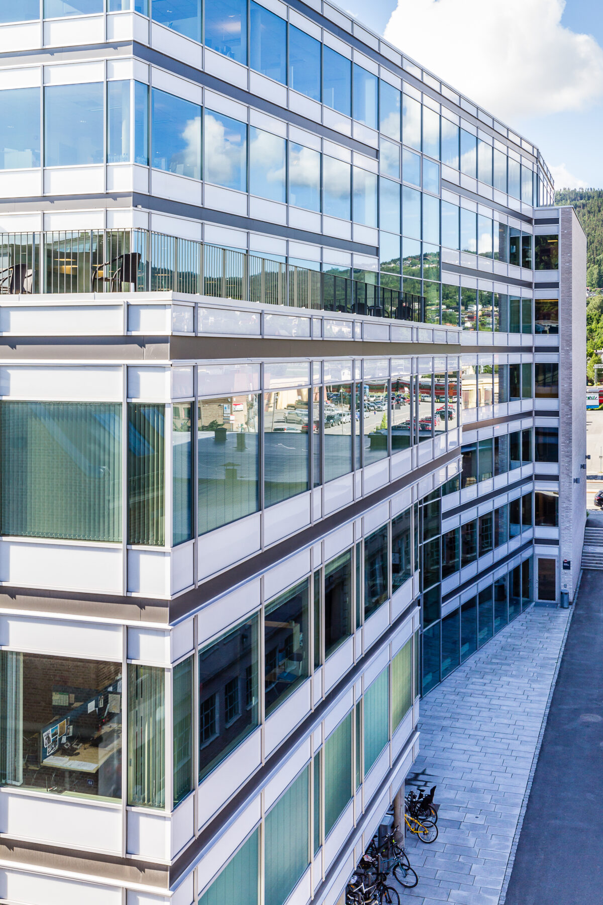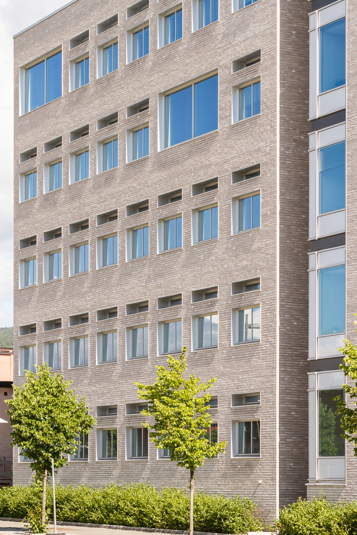 Det er ustrakt bruk av tegl, glass og natureloksert aluminium. Teglfasaden er utviklet i samarbeid med Bratsberg tegl, og gir huset en unik karakter. Mot vest og nord er det en systemfasade med glass og isolert brystning med hvitt, emaljert fasadeglass og aluminium. Bygget er prosjektert og bygget i tråd med ny teknisk forskrift.