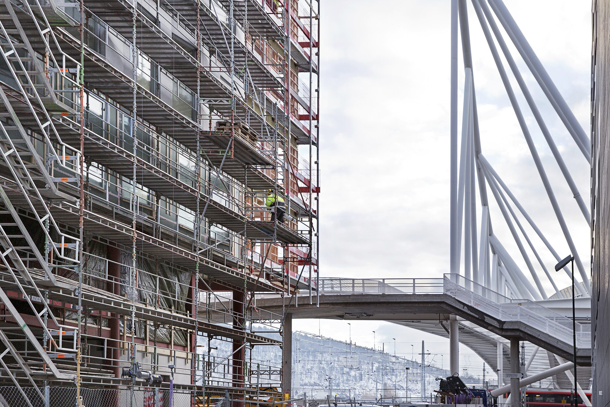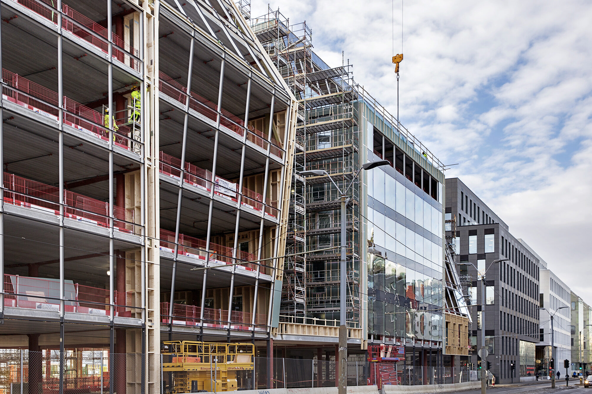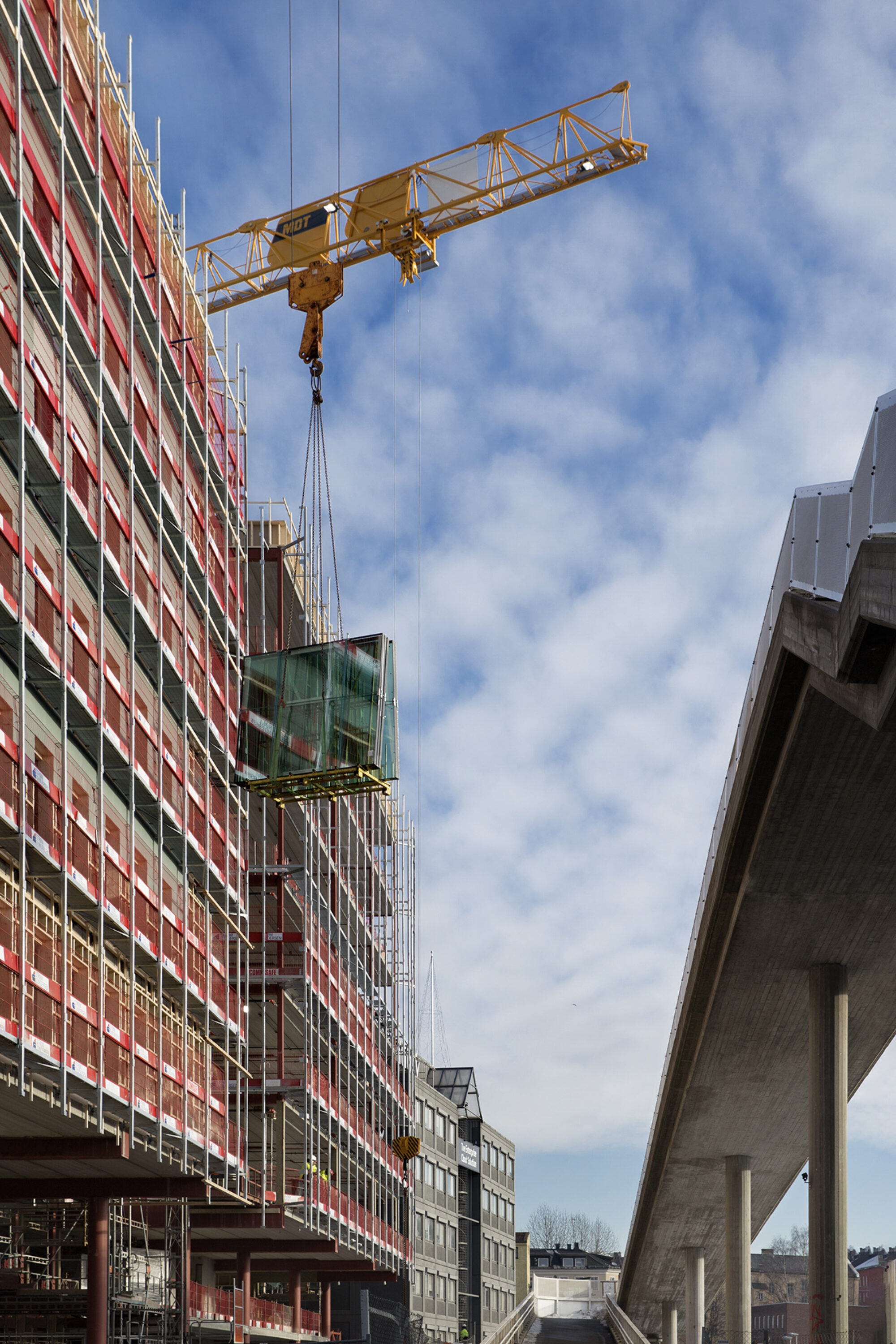Det jobbes høyt og lavt på det 22 000 kvadratmeter store bygget hvor utførende entreprenør Strøm Gundersen AS til nå har fått opp alt av bærende kontruksjoner, trappeløp og betongdekker. Store glassflater heises på plass og vinduer monteres. Det er mye glass som skal på plass, da den nye kontorbygningen skal ha heldekkende glassfasader mot nord og en utenpåliggende solcellevegg mot syd.