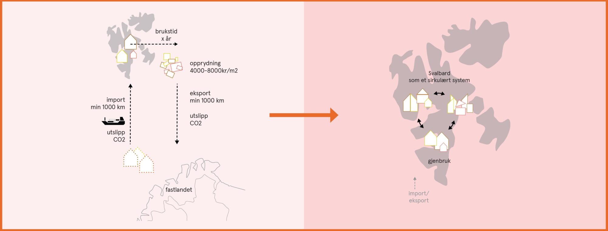 LPO ser fordeler på alle kanter ved å gjenbruke materialer som allerede er på Svalbard, framfor å gjøre som praksis har vært i alle år og som Ingvild beskriver; nemlig «å rive skiten og bygge nytt». Det første, og mest innlysende, er at det er en betydelig klimagevinst i å gjenbruke materialene som allerede er på Svalbard, framfor å frakte dem ned og frakte nytt opp igjen.