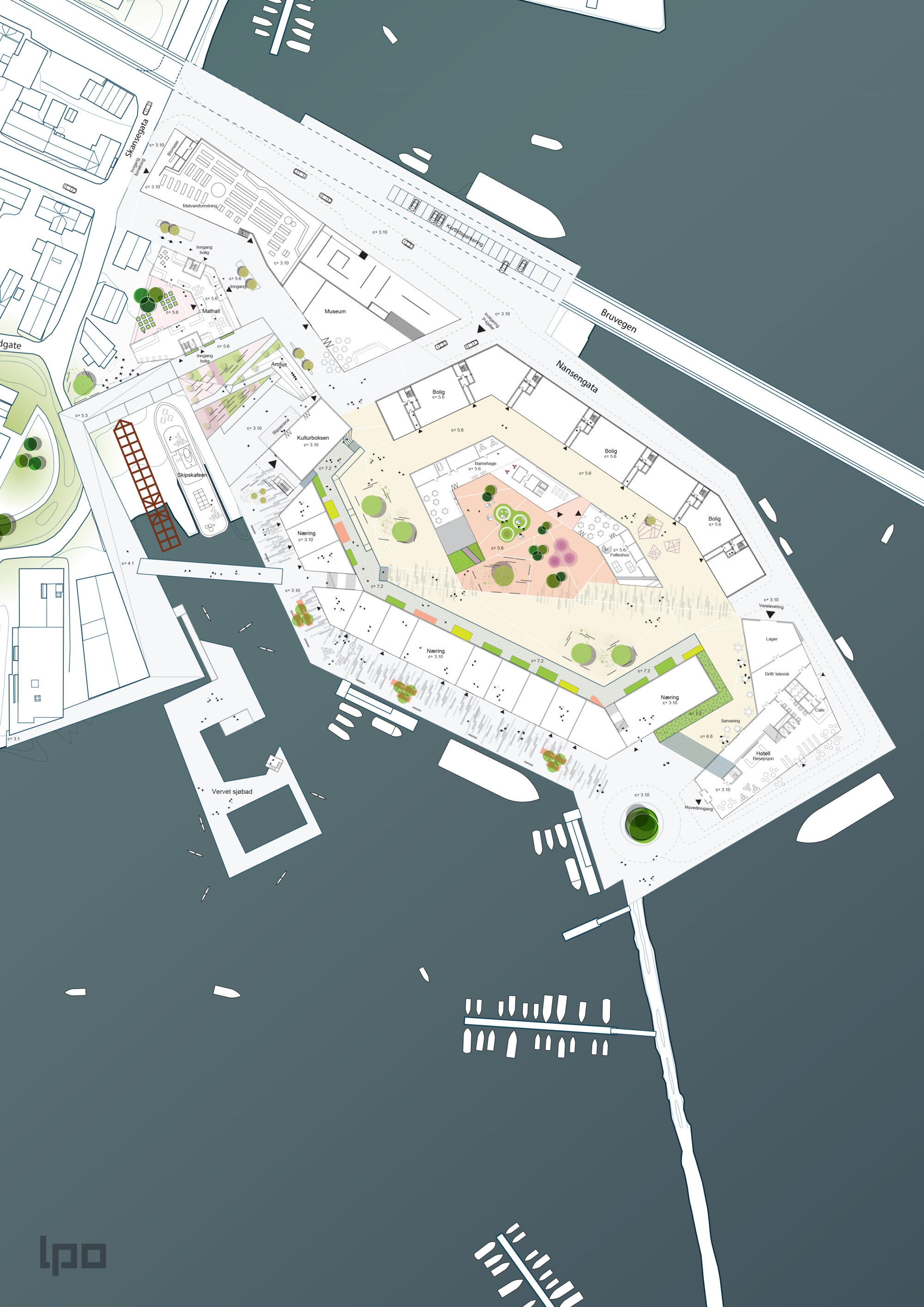 Et av de viktigste grepene LPO foreslo i konkurranseforslaget var å bevare det gamle maskinverkstedet og de gamle slippene for båter. Disse industrielle elementene er så integrert inn i området gjennom etableringen av et nytt torg og sjøfront.