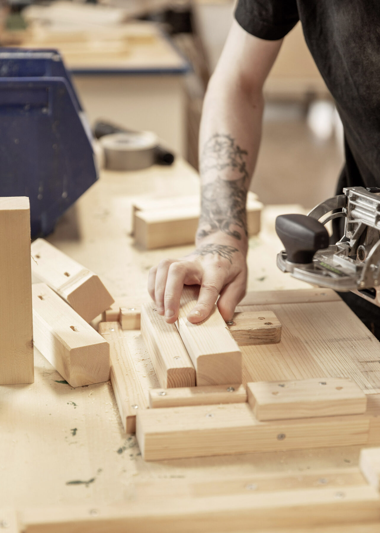 I et av produksjonsrommene finner vi Ken Roger Evensen og Oscar Johnsen i full sving med å gi nytt liv til rester og avkapp fra reisverk. Disse materialene forvandles til byggeklosser for Oppatts bygningsmoduler, som skal stilles ut på messen «Bygg reis deg» på Lillestrøm i oktober. Etter at trebitene er kappet til riktig lengde, boret hull i og fått plugger, kan de enkelt settes sammen til de mange ulike modulene LPO arkitekter har tegnet.