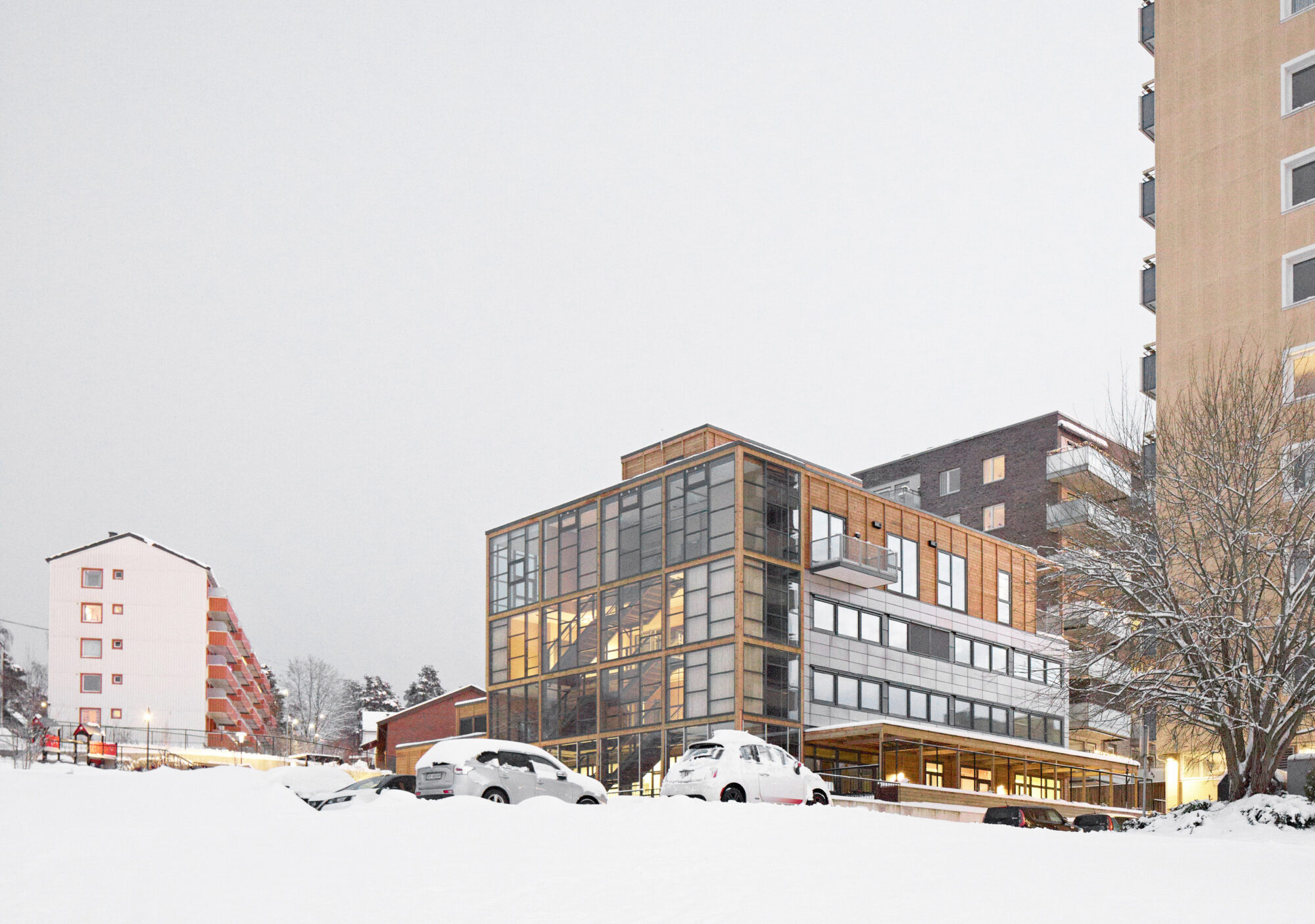 Rehabiliteringen av det tidligere nærings- og kontorbygget på Oppsal har resultert i et moderne bygg med både barnehage, helsetjenester og boliger i to påbygde etasjer. Prosjektet har lagt sterk vekt på ombruk og sirkulære byggestrategier – et kjernepunkt i årets pris, som fokuserer på varsom ressursbruk og gjenbruk av eksisterende bygningsmasse.