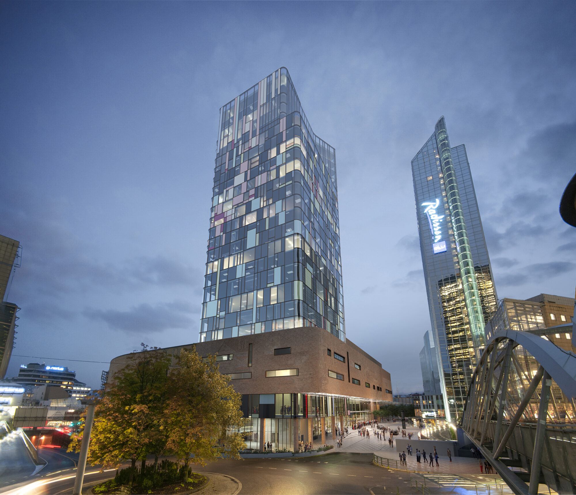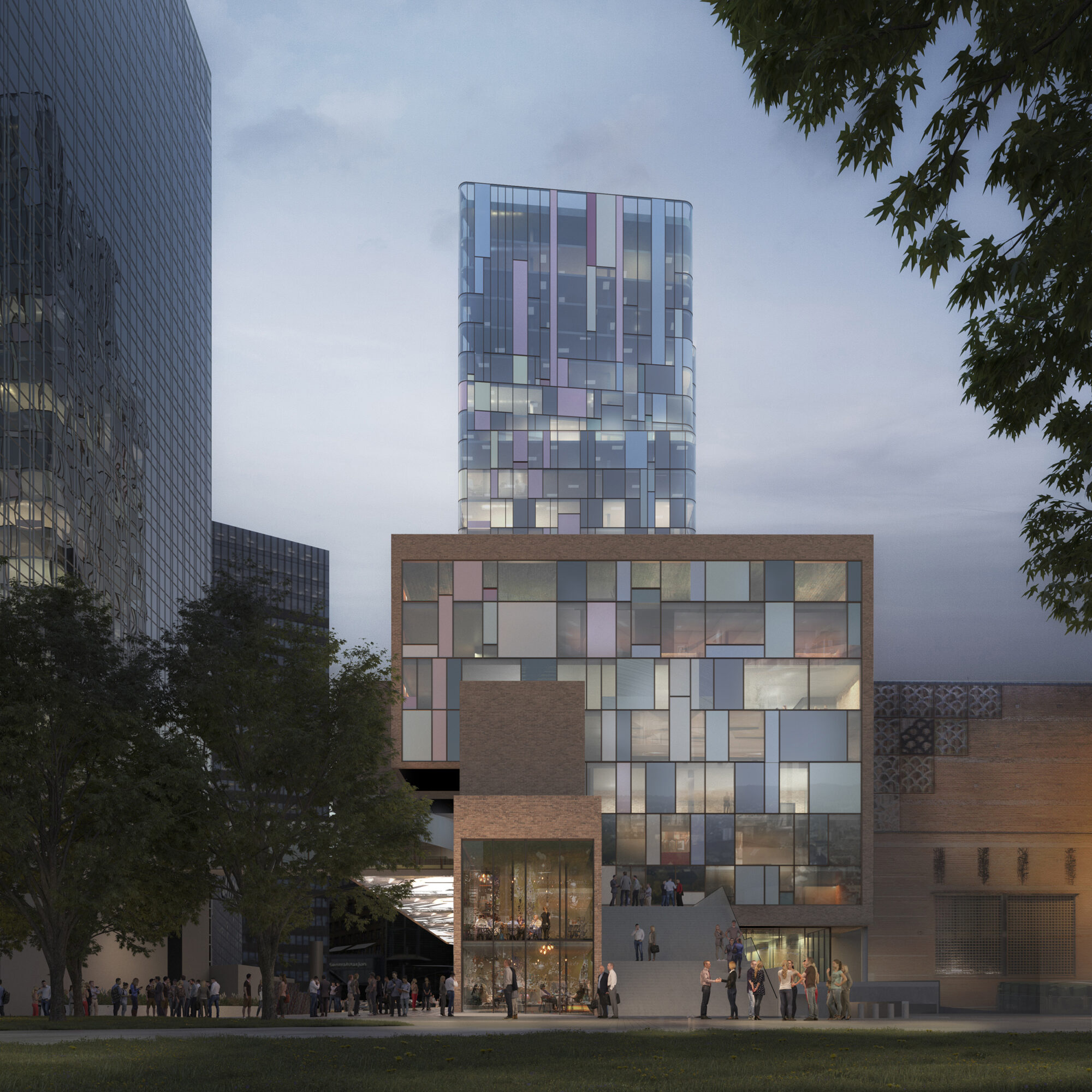 At høyhuset også er utformet i glass, gir en kontrast til den lavere kongressdelen, samtidig som det tar opp i seg elementer og fargebruk fra byhallens fasader. Fasaden skal få en rikhet, en variasjon og en fargebruk som kan bidra til at området får et arkitektonisk og kvalitetsmessig løft.