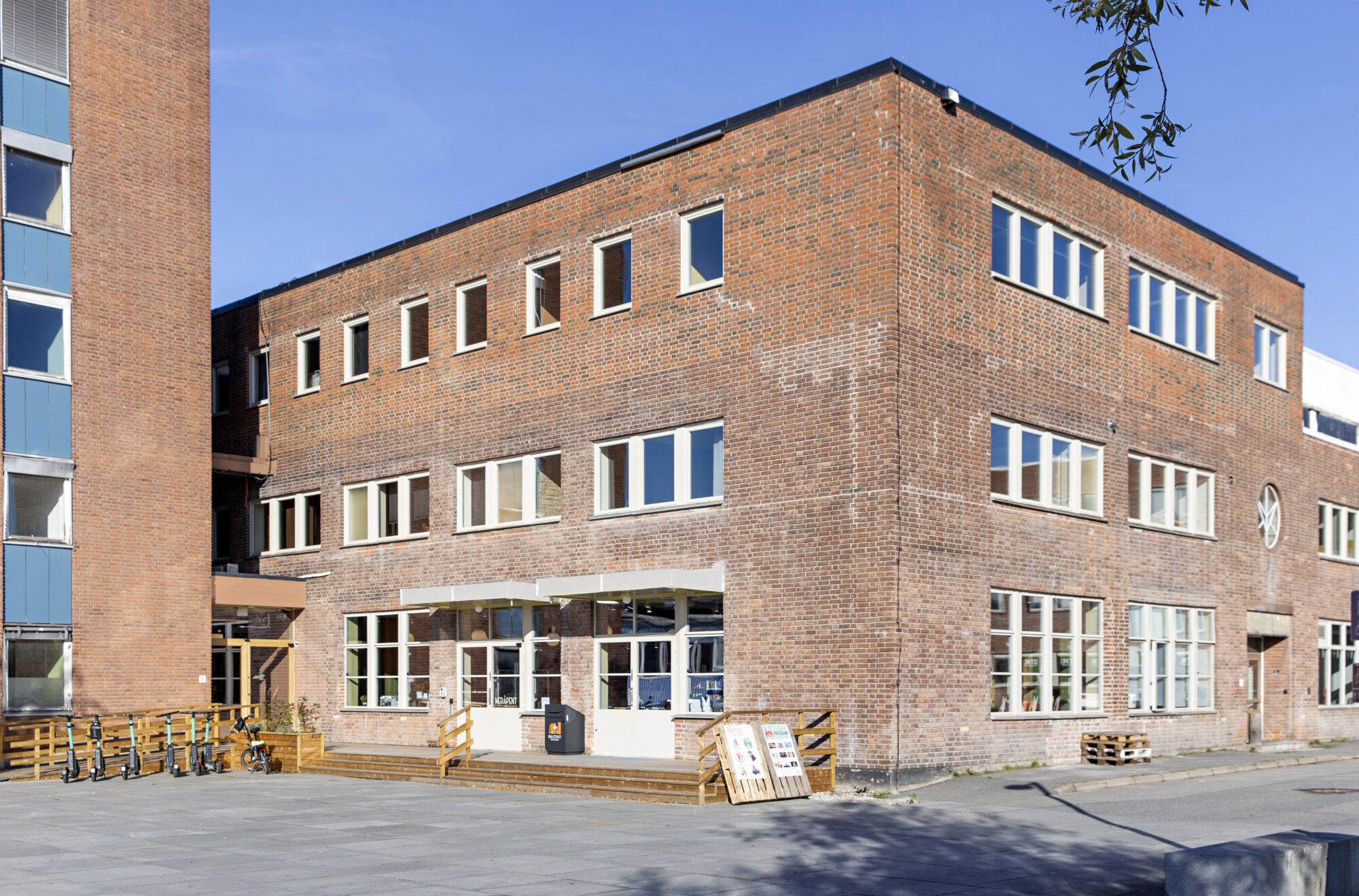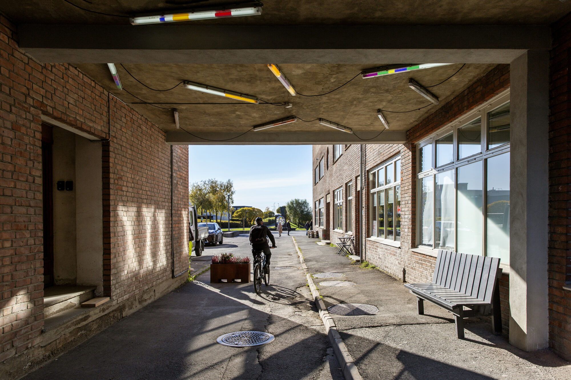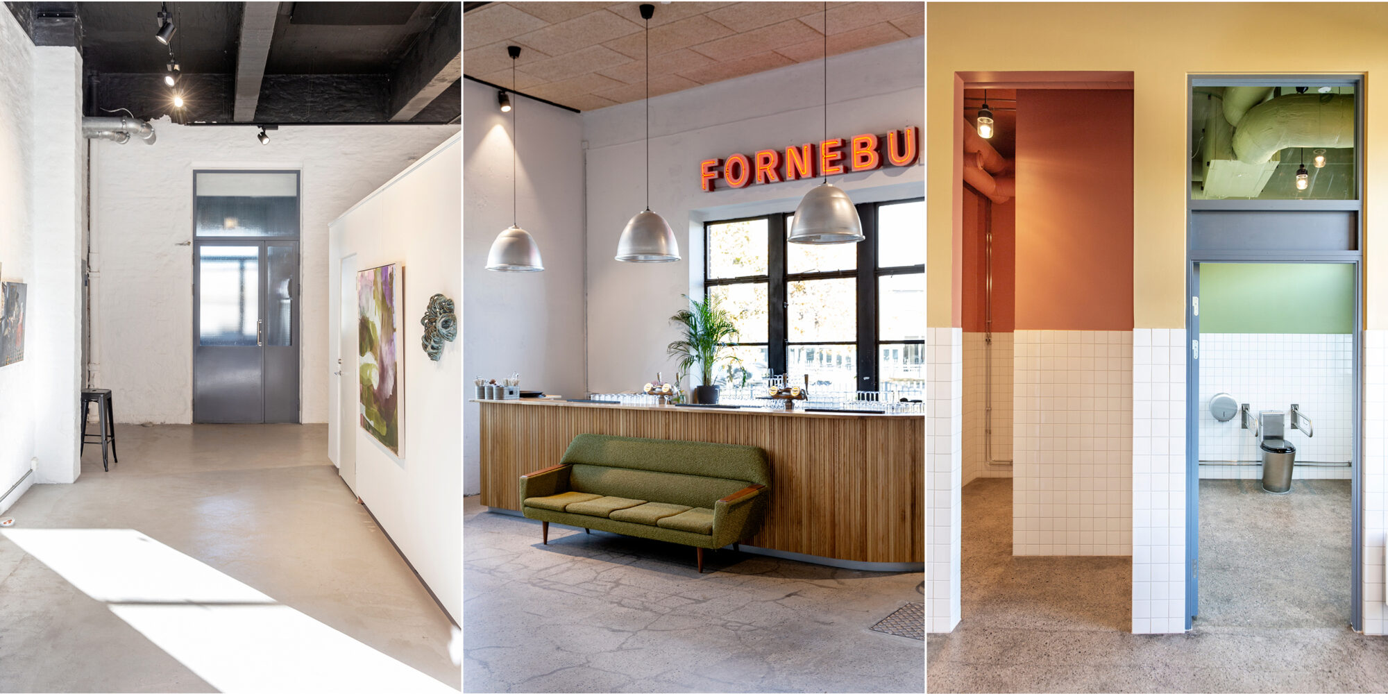 I byggene har vi gjenbrukt og bevart så mye som mulig. Betonggulvene er frilagt og slipt, og linoleumsbelegget fra 1940 renset og bonet. Vi har supplert med biter av nytt belegg der hvor noe manglet, og huller i betongen er tettet med støp. Fargene i lokalene er valgt ut ifra skrapeprøver tatt på Flytårnet; klassisk fargesetting fra oppføringen på 40- og 60-tallet. Dette bidrar til bebyggelsens særpreg og forankring i historien.