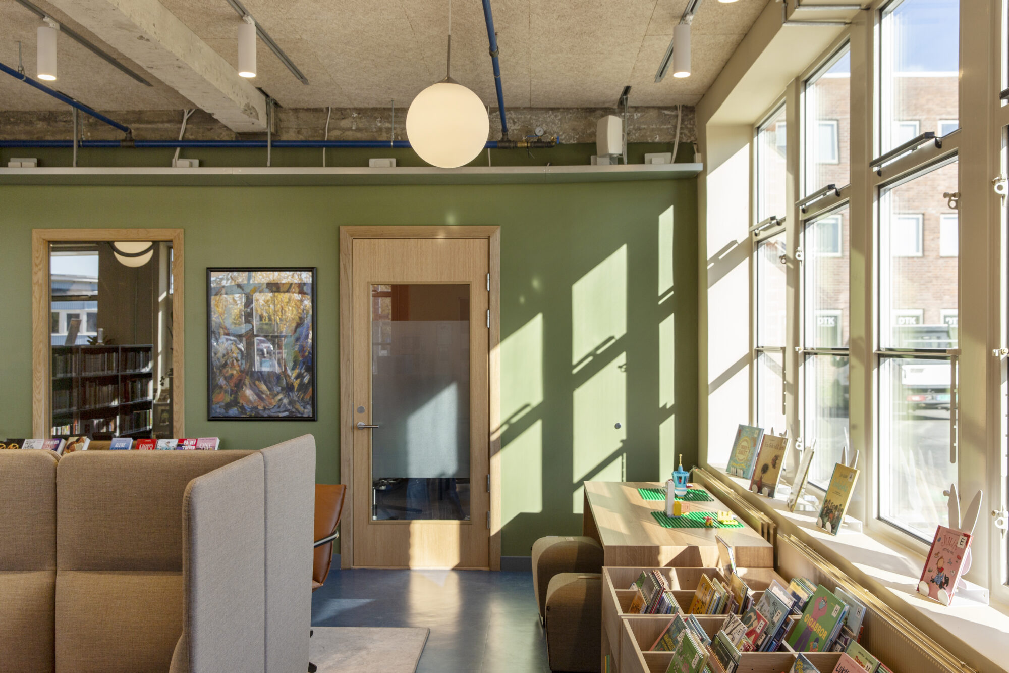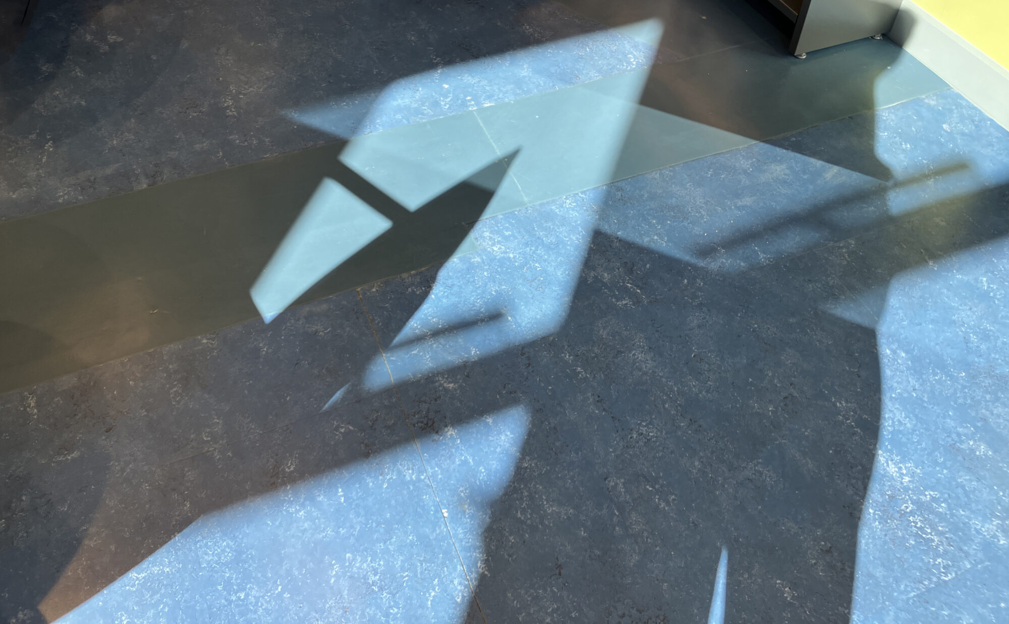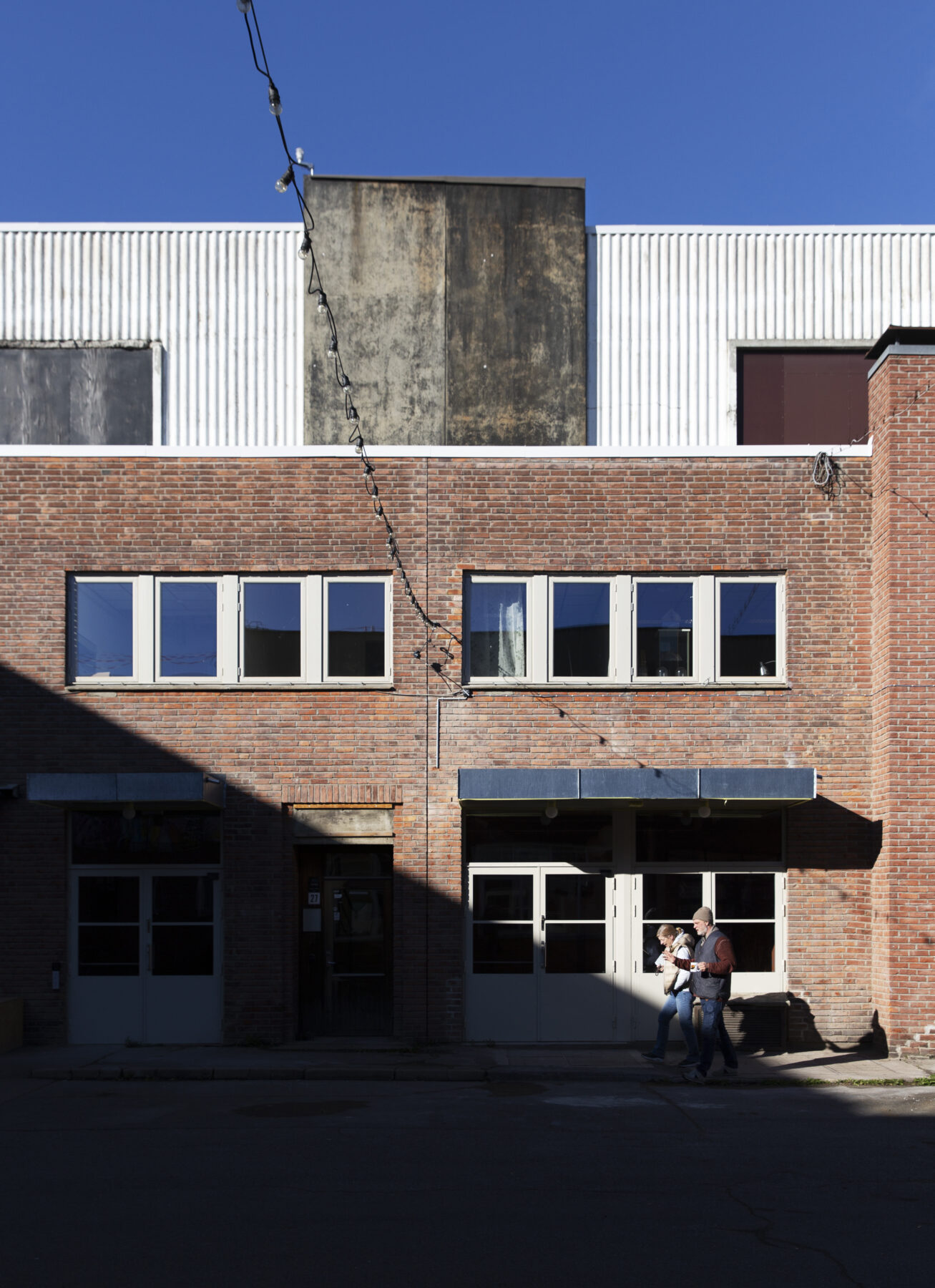 I byggene har vi gjenbrukt og bevart så mye som mulig. Betonggulvene er frilagt og slipt, og linoleumsbelegget fra 1940 renset og bonet. Vi har supplert med biter av nytt belegg der hvor noe manglet, og huller i betongen er tettet med støp. Fargene i lokalene er valgt ut ifra skrapeprøver tatt på Flytårnet; klassisk fargesetting fra oppføringen på 40- og 60-tallet. Dette bidrar til bebyggelsens særpreg og forankring i historien.