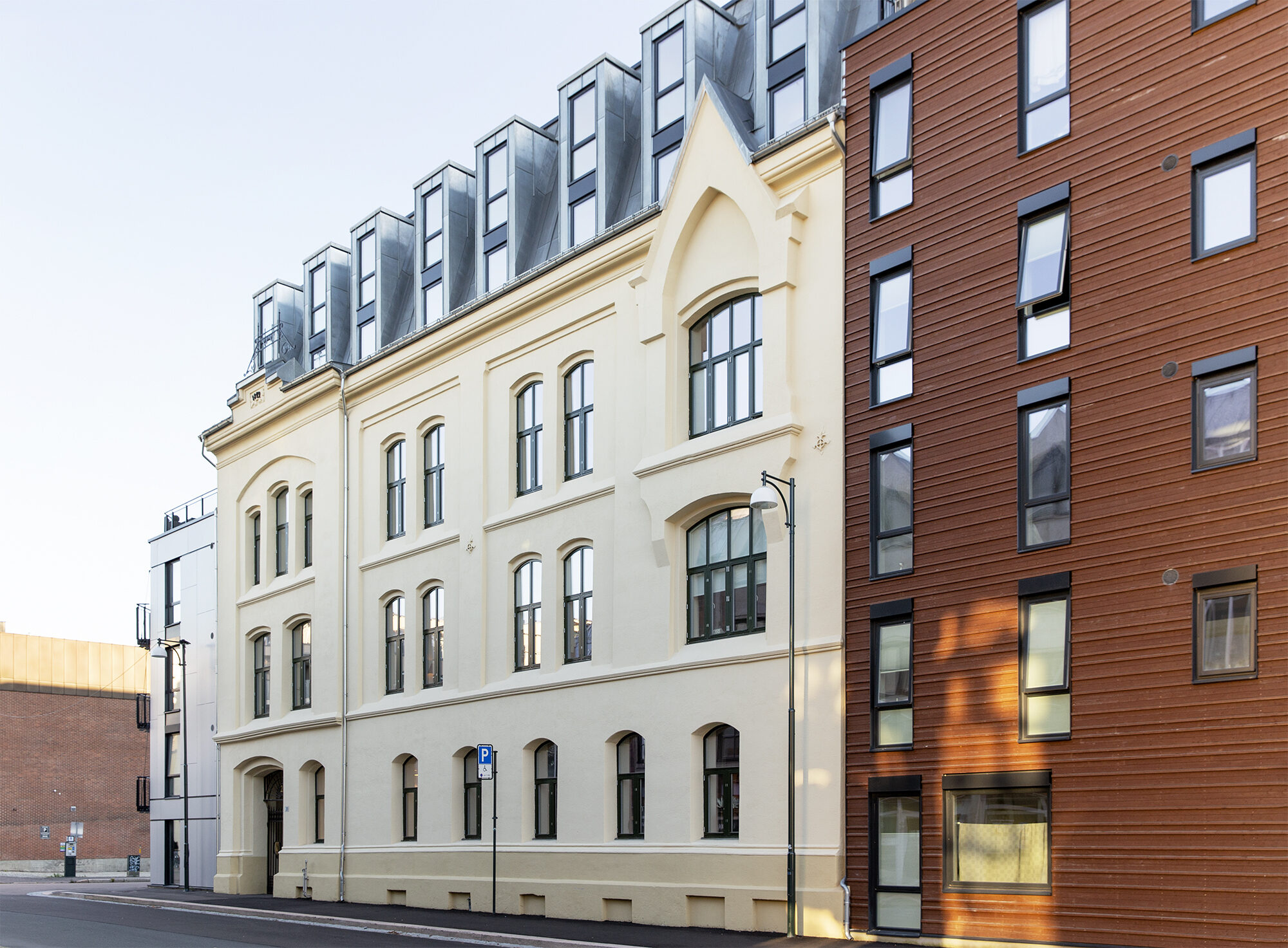 Det ble tidlig i prosessen besluttet å bevare den gamle skolebygningen til Gjerde pikeskole, Gjerdegården, fra 1879. Store deler av bygget var i relativt dårlig stand. Bygningen ble rehabilitert og oppgradert innvendig og utvendig i samarbeid med kommunen og byantikvaren, og fikk i tillegg en ekstra etasje. Pga. omfattende råteskader ble det ble lagt nytt bjelkelag i alle etasjer, alle vinduer ble skiftet med nye i tilsvarende utforming og materialer. Fasaden ble nøysomt rehabilitert og tilbakeført til original farge. Det nye takoppbygget med sine karakteristiske arker, ble utformet etter inspirasjon fra den nærliggende «Astræagården» fra samme epoke. Innvendig har bygget fått ti leiligheter, samt felles hobbyrom og boder i kjelleren. Portrommet og det original trappeløpet er restaurert.