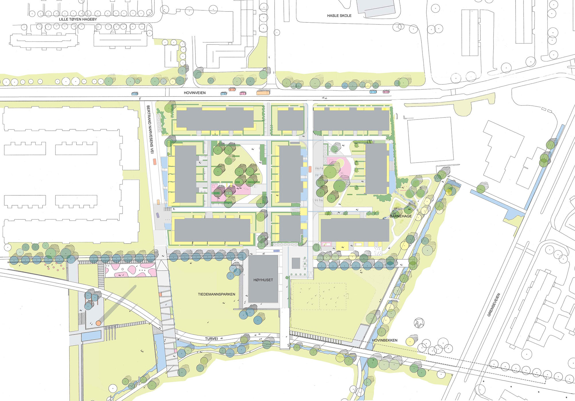 Tomten ligger til Hovinveien er nærmeste nabo til Lille Tøyen hageby. Mot sør ligger Tidemansparken, hvor Hovinbekken er brakt opp i til overflaten igjen.