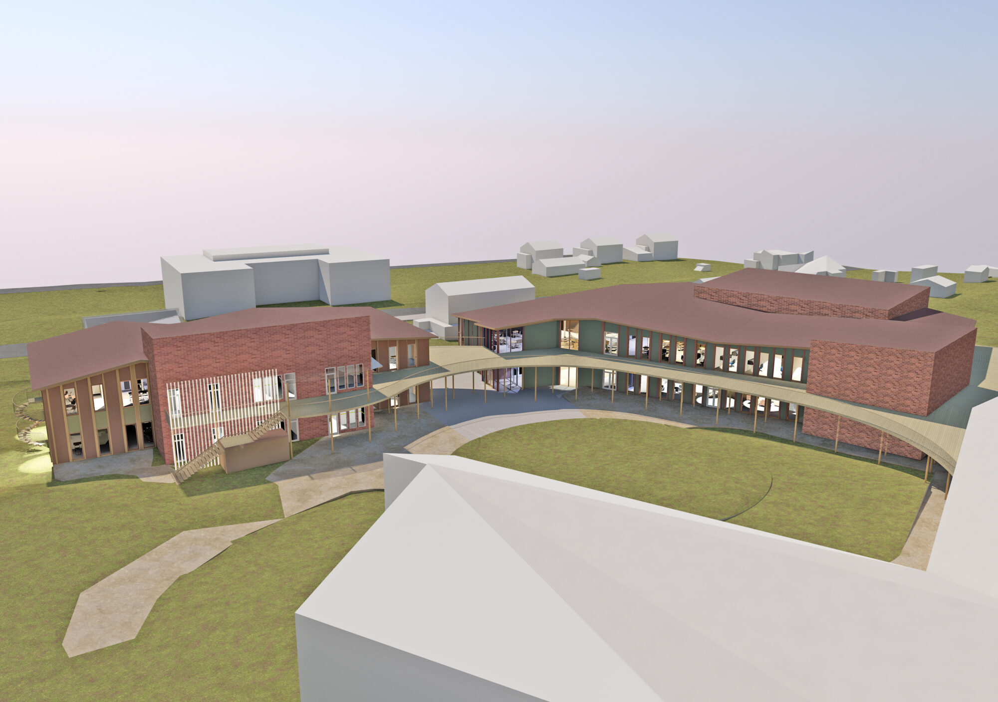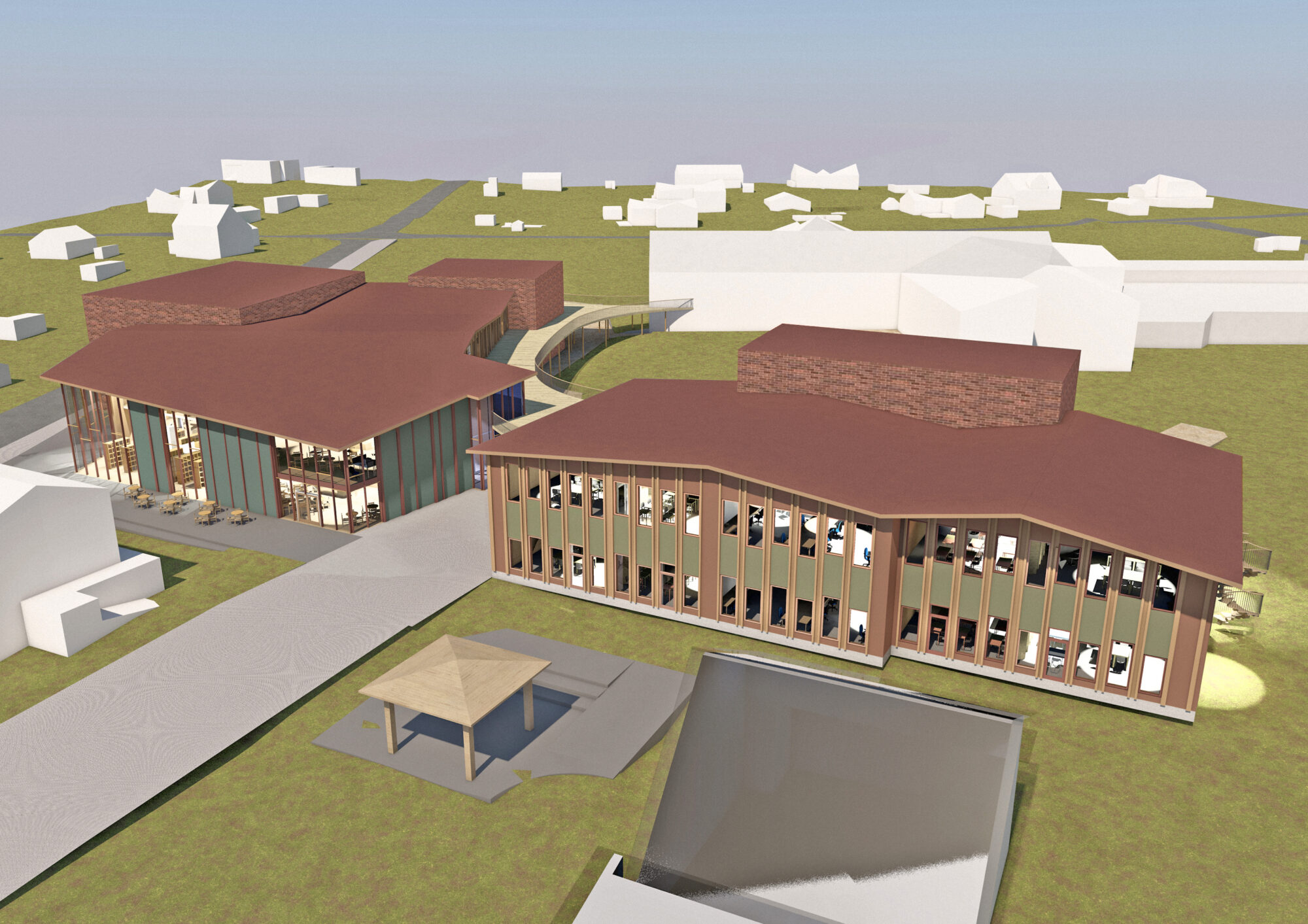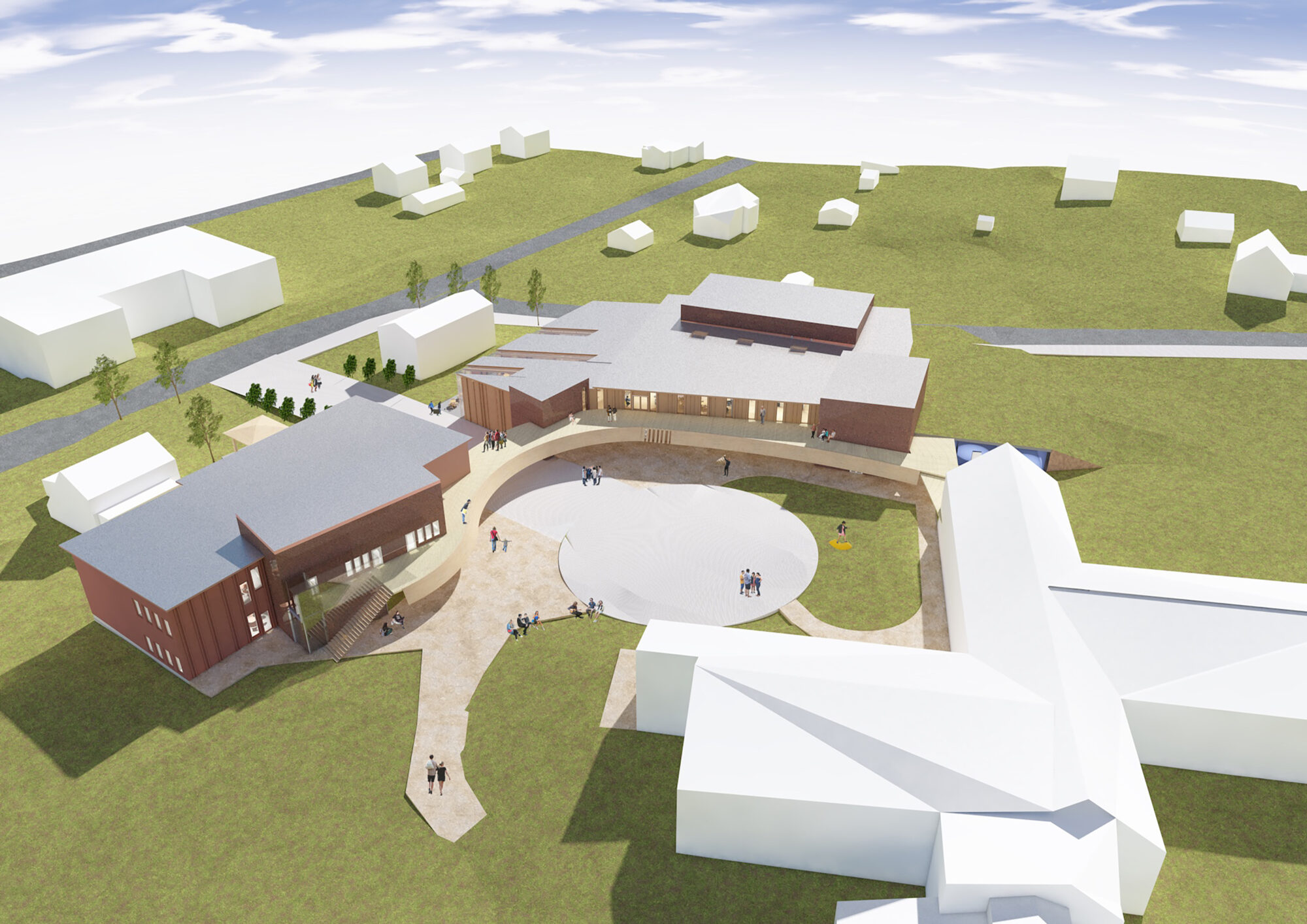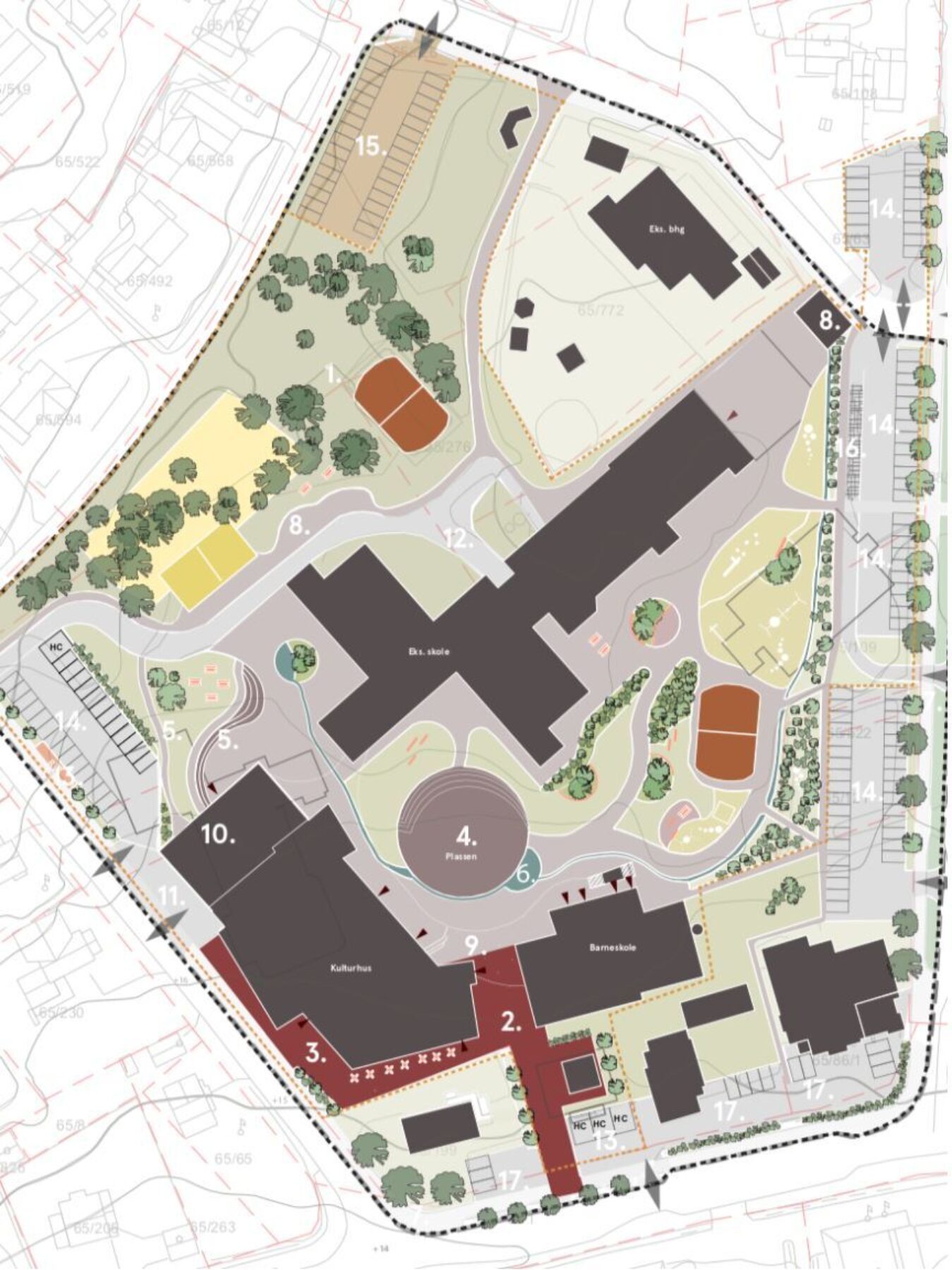 Kulturhus, bibliotek og barneskole med tilhørende utomhus.