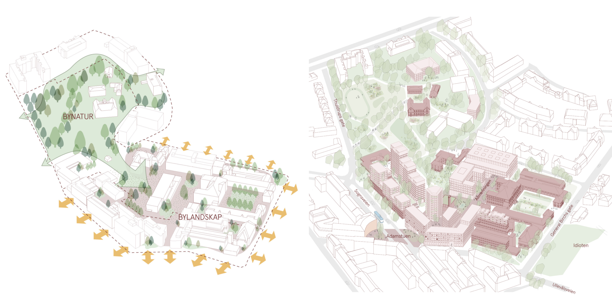 Natur og urbanitet knyttes sammen ved at den konsentrerte byen og bygulvet gir plass for mer natur, parker og hager. Den nye bydelen utvikles på det eksisterende fotavtrykket og får dermed sitt sentrum og tyngdepunkt ved det urbane knutepunktet på Adamstuen. Dette gir en utbygging knyttet til kollektivtransport og til et gatenett som sprer seg i alle retninger i det sentrale Oslo. Med forslaget Oslo mer Oslo skaper vi både mer natur og mer by.