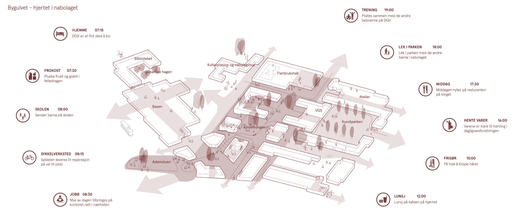 Ved å etablere en Allmenningen, som går gjennom midtområdet, styrker knutepunktet på Adamstuen, og skaper et sentrum med forbinder på tvers. Allmenningen er ryggraden i bygulvet med utadrettede førsteetasjer og varierte byrom som sikrer at besøkende, beboere og naboer kan strømme gjennom DGV.
