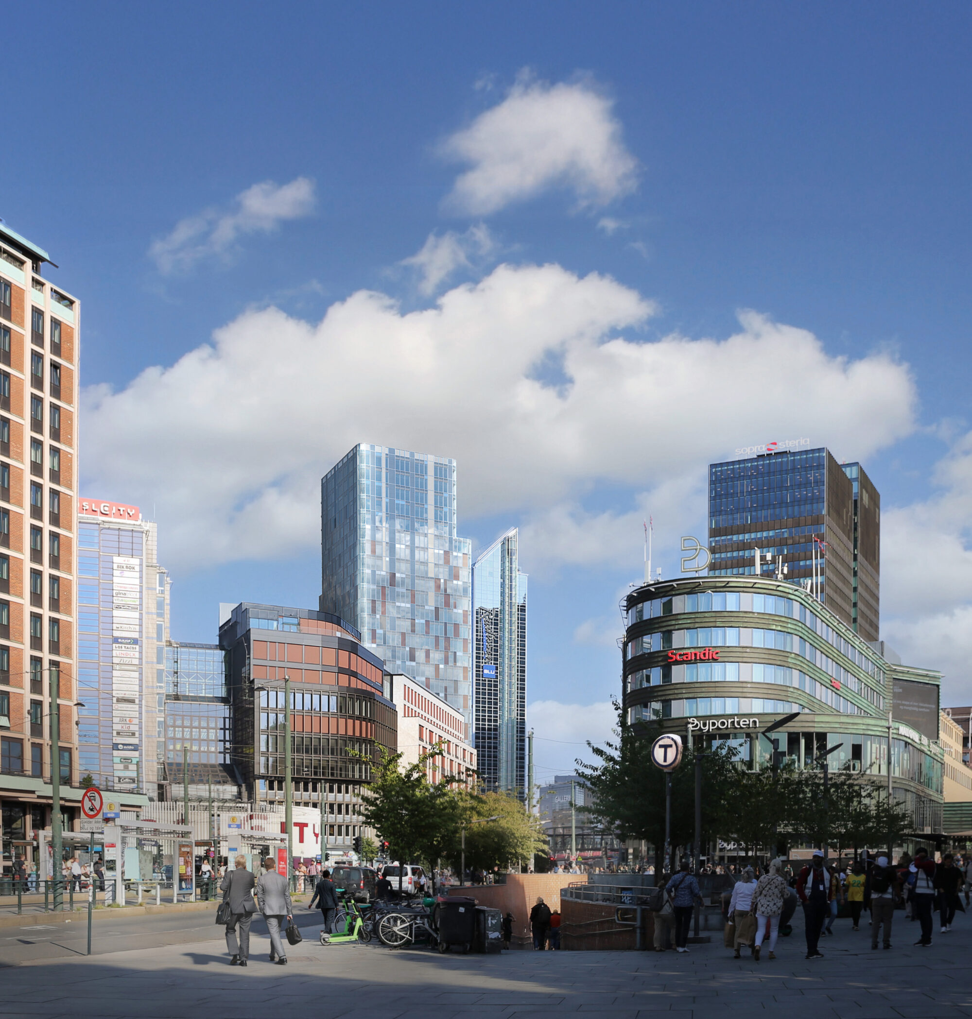 Tidligfaseanimasjon som viser Sonja Henies plass og det overdekte inngangspartiet. Himlingen kan brukes til å eksponere det som skjer på innsiden av bygget. Visualisering og redigering: LPO