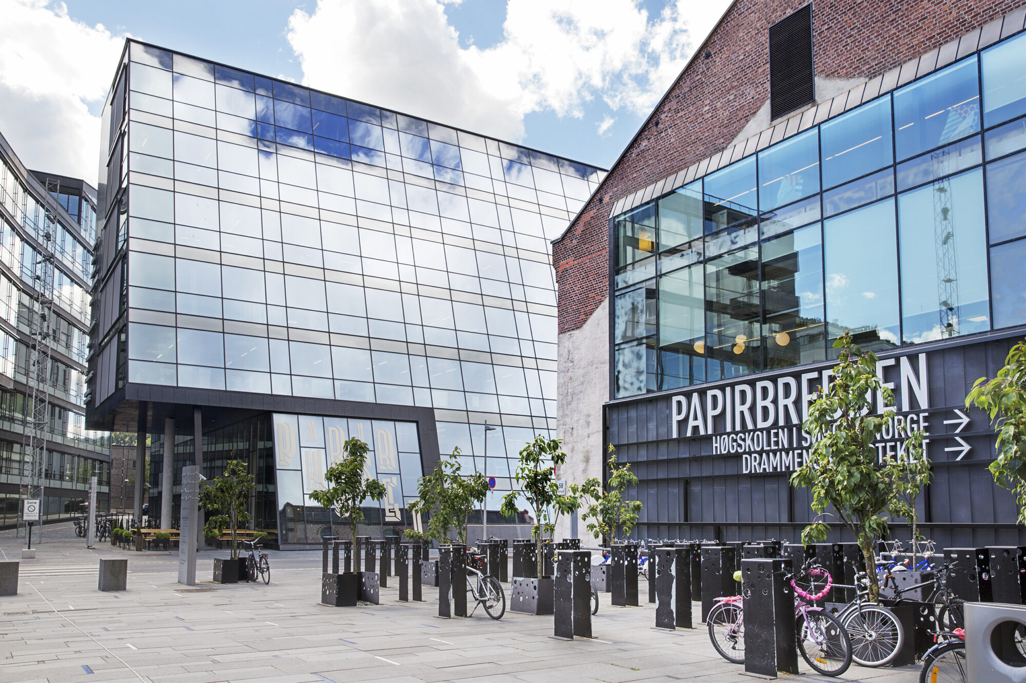 Bygningen er utformet med regulære etasjer som omslutter et høyt atrium. Mot dette atriet er auditorier og andre spesialfunksjoner samlet i en sylindrisk hovedform med referanse til de gamle industrisiloene på plassen utenfor. I tillegg til disse siloene er det opprinnelige «Hollenderiet» rehabilitert som del av det nye biblioteket. Hele anlegget står på «Den Blå plass» som både binder det sammen og ivaretar en kontinuitet fra byen, gjennom den nye bygningen og ut til elva. Prosjektet er utviklet med stor rasjonalitet og gjennomført på svært kort tid. Papirbredden 1 ble åpnet i 2007 og inneholder høgskole, Norges første sambibliotek og innovasjonsbedrifter.