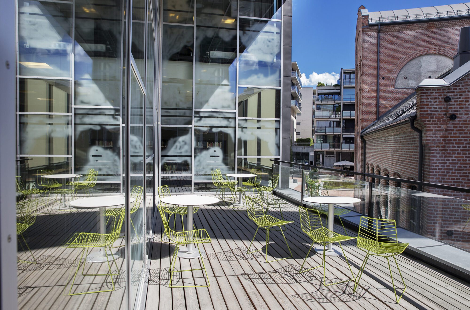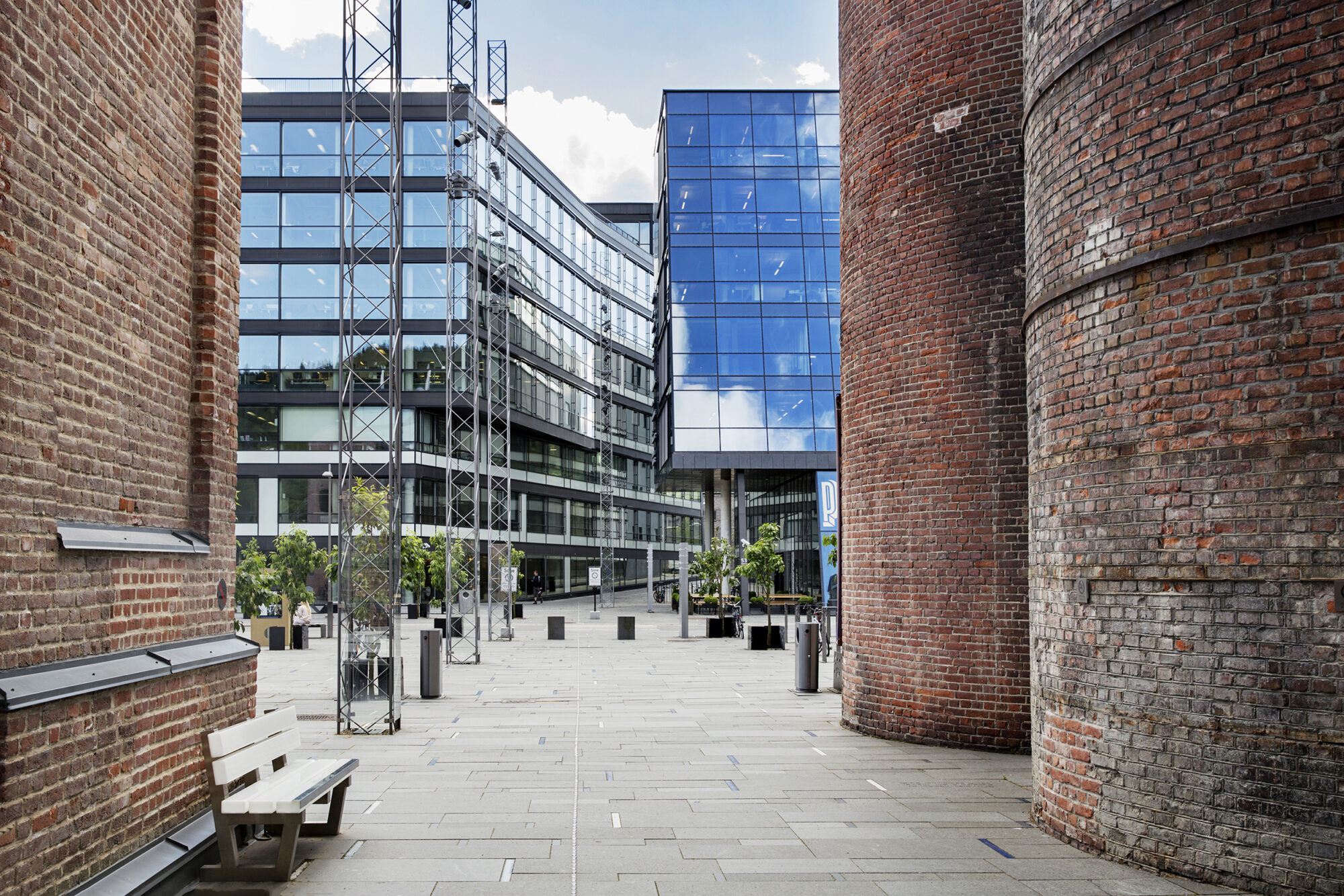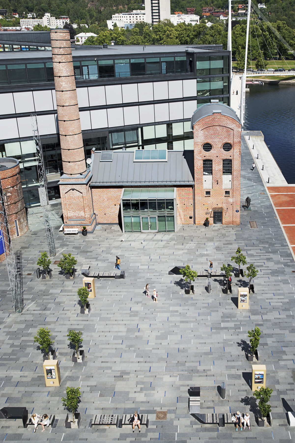 LPOs konkurransegrep var å etablere et bygulv – den blå plass – som kunne gi rom for en etappevis utbygging. Bygulvet er nå ferdigstilt og består av et sammenhengende granittgulv – inne og ute. Utomhus framstår anlegget som noe unikt, med egenutviklede elementer som sykkelstativ, lamper og benker. Anlegget er realisert med en enkel materialpalett bestående av naturstein, aluminium, glass og alle beslag i patinert zink. Samlet utgjør hele Papirbredden med de tre bygningene og parkeringskjeller ca. 50 000 m2.