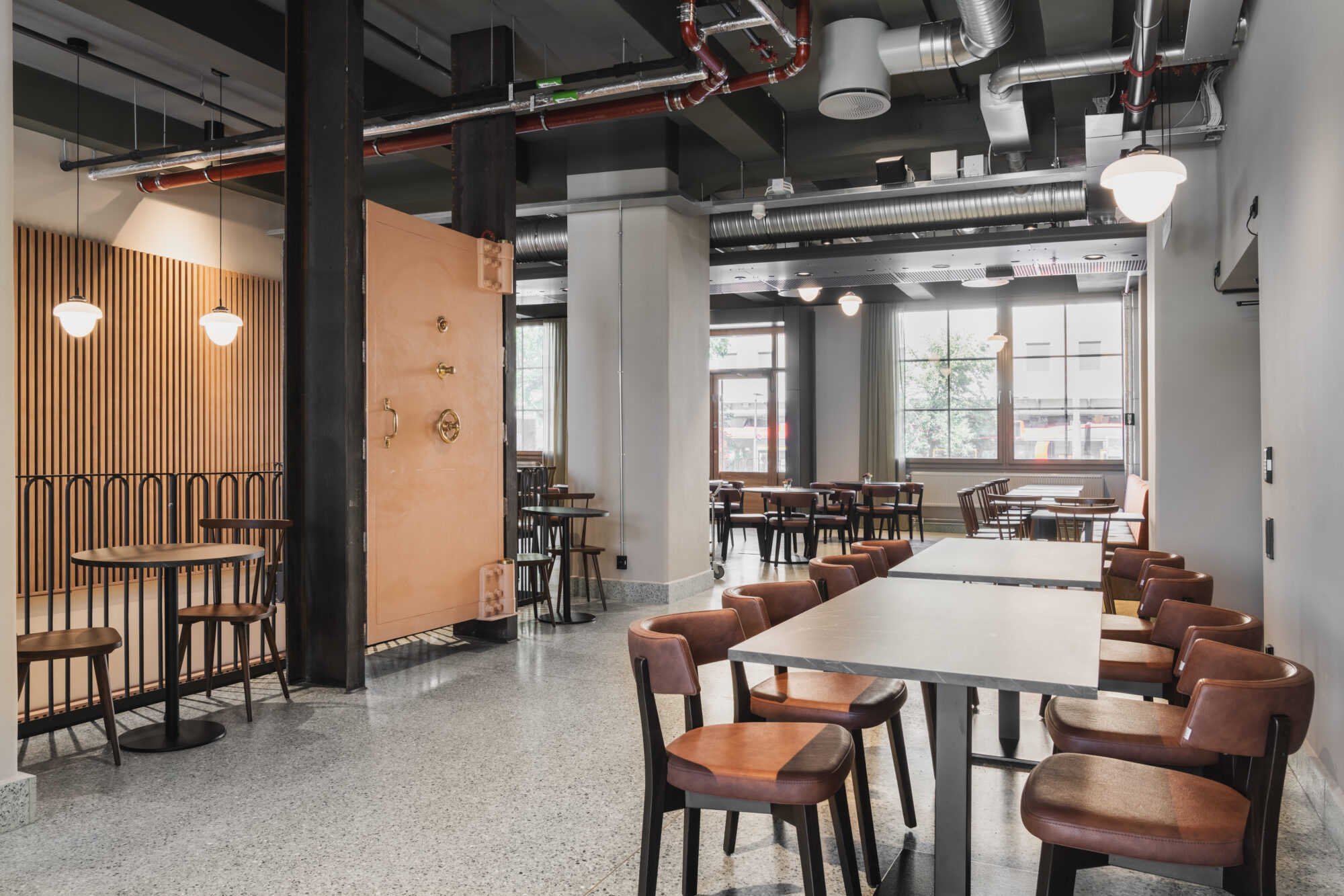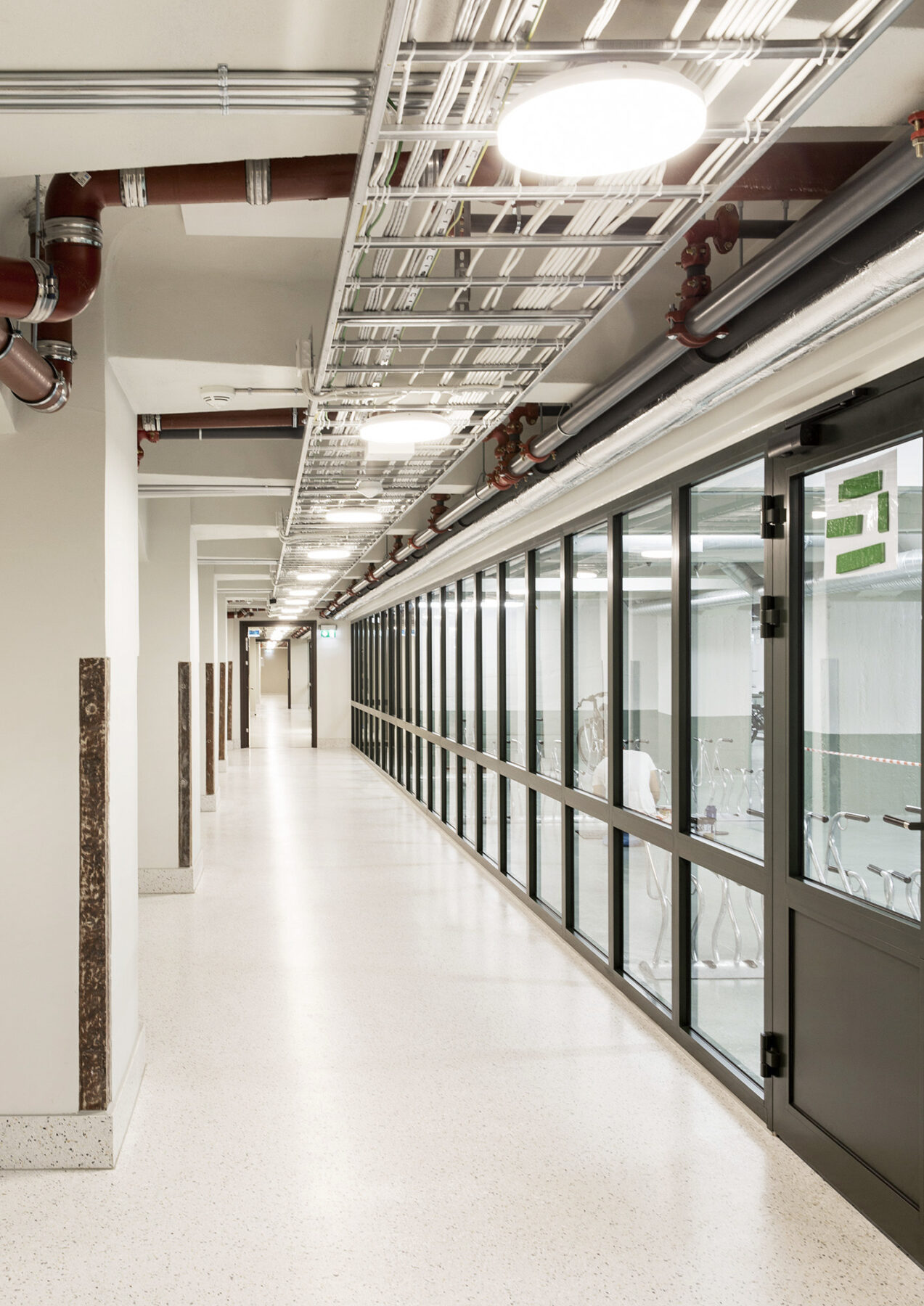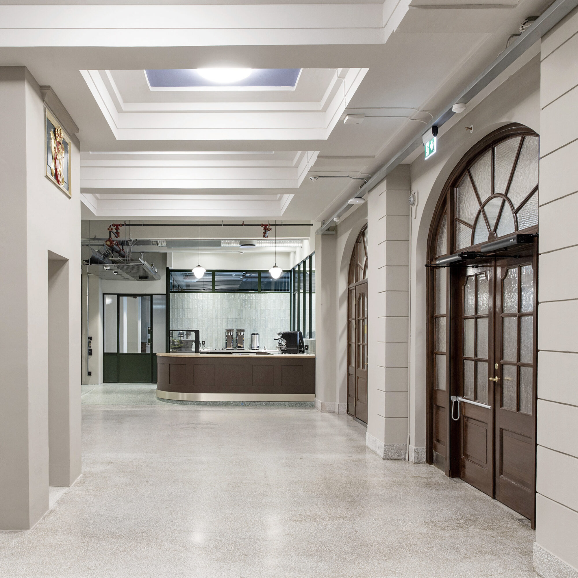 Trapperom og vestibyler er fredet. Himlingsmotiver er istandsatte og tilbakeført til originale farger. Spor etter hull i gulvet fra en tidligere heissjakt kan leses ved at terrazzoen i dette området har en annen valør enn den originale. Dører er istandsatt med teknikker brukt opprinnelig som ådring, eller erstattet med replika av originale i posisjoner der det har vært dører som er mistet. Foto: Dag SandvenI byggets første etasje er det en kantine som også kan brukes til restaurant-drift på kveldstid og i helger. Nye innganger har fått vindfang med glassvegger som bidrar til sonedeling av arealet. Foto: Dag SandvenLPO har tegnet nye lamper basert på bilder av originale lamper fra byggets opprinnelsesår. Foto: Dag SandvenDen opprinnelige hvelvdøren er renovert og har fått en ny posisjon som et smykke i kantinen. Foto: Dag SandvenEt hovedgrep for bygget har vært å åpne fasaden der det opprinnelig var lasteramper mot Schweigaardsgate i nordøst. Her er tette vegger erstattet med glassfelt som løper bak søylene for å gjøre denne åpenheten så nært opprinnelig uttrykk som mulig. Foto: Dag SandvenKontorlokalene har blitt lyse og fleksible arealer. Det har vært etterstrebet å gjøre den vakre ribbekonstruksjonen lesbar og det er derfor valgt et system med åpen teknikk der det langsgående tekniske ligger åpent over en metallflåte og ventilasjonsbaffler og annen teknikk er lagt inn mellom ribbene. Foto: Dag SandvenGlass-systemvegger er designet basert på bilder av de opprinnelige skilleveggene i bygget og det er benyttet rilleglass slik det var opprinnelig. Det er jobbet mye med en dempet material- og fargepalett som harmonerer med historien til bygget. Foto: Dag SandvenFoto: Dag SandvenEt stort atrie binder 1. etasje sammen med kjelleren. På den måten bringes lys og åpenhet ned til kjelleren og gjør det mulig å bruke det lokalet i sammenheng med kantine- og restaurant-området i plan 1. Foto: Dag SandvenDen sobre fargepaletten på de generelle kontorarealene har det vært enkelt for leietakerne å finne seg til rette i. Foto: LPO arkitekterI vestibylen i første etasje møtes man av tolletatens emblem som et minne om byggets opprinnelse. Den er tilbakeført med opprinnelige farger. Her har LPO designet en nye disk for barception inspirert av den originale resepsjonsdisken i bygningen. Foto: LPO arkitekterNy interntrapp er addert for å knytte leietakerareal sammen på tvers av etasjer. Foto: LPO arkitekterHovedadkomst for mange brukere av bygget går via sykkelparkeringen i kjelleren. Derfor er det lagt stor innsats i å gjøre den hyggelig. Når søylene fikk nytt sjikt med puss valgte vi å ikke dekke til de opprinnelige hjørneforsterkningene, men la dem få komme fram med sin patina og fortelle historien om hvordan bygget har vært brukt som mellomstopp for varer til fortolling. Foto: LPO arkitekterSchweigaardsgate er et strøk av byen som er i transformasjon. Bygningen er satt i stand og er klar for å ta imot de endringene som kommer. Foto: EntraBygningens eksteriør er fredet i sin helhet og vindusdetaljer og ornamentikk i fasaden er tilbakeført til sin opprinnelige fargesetting med originale malingstyper og teknikker. Foto: Entra