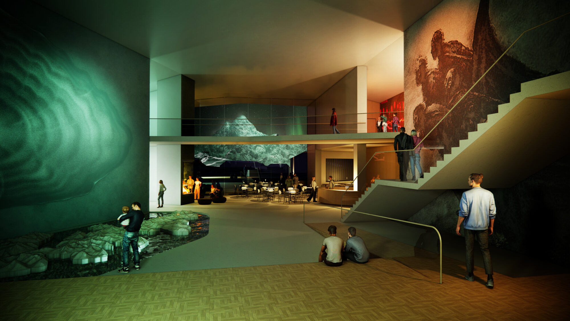 Prosjektet er tilpasset landskapet med de lave kollene, byggets form skal ikke dominere eksisterende bygninger. Nybygget har derfor en dempet form med underskjæringer som følger rampene i vandringen inne. Det planlegges å bruke lokalprodusert betong, varme- og linoljebehandlet tre, sammen med gjenbruksglass i fasaden. Med dempet lysdesign i glassfasaden skal bygningen «gløde» svakt i den lange mørketiden.