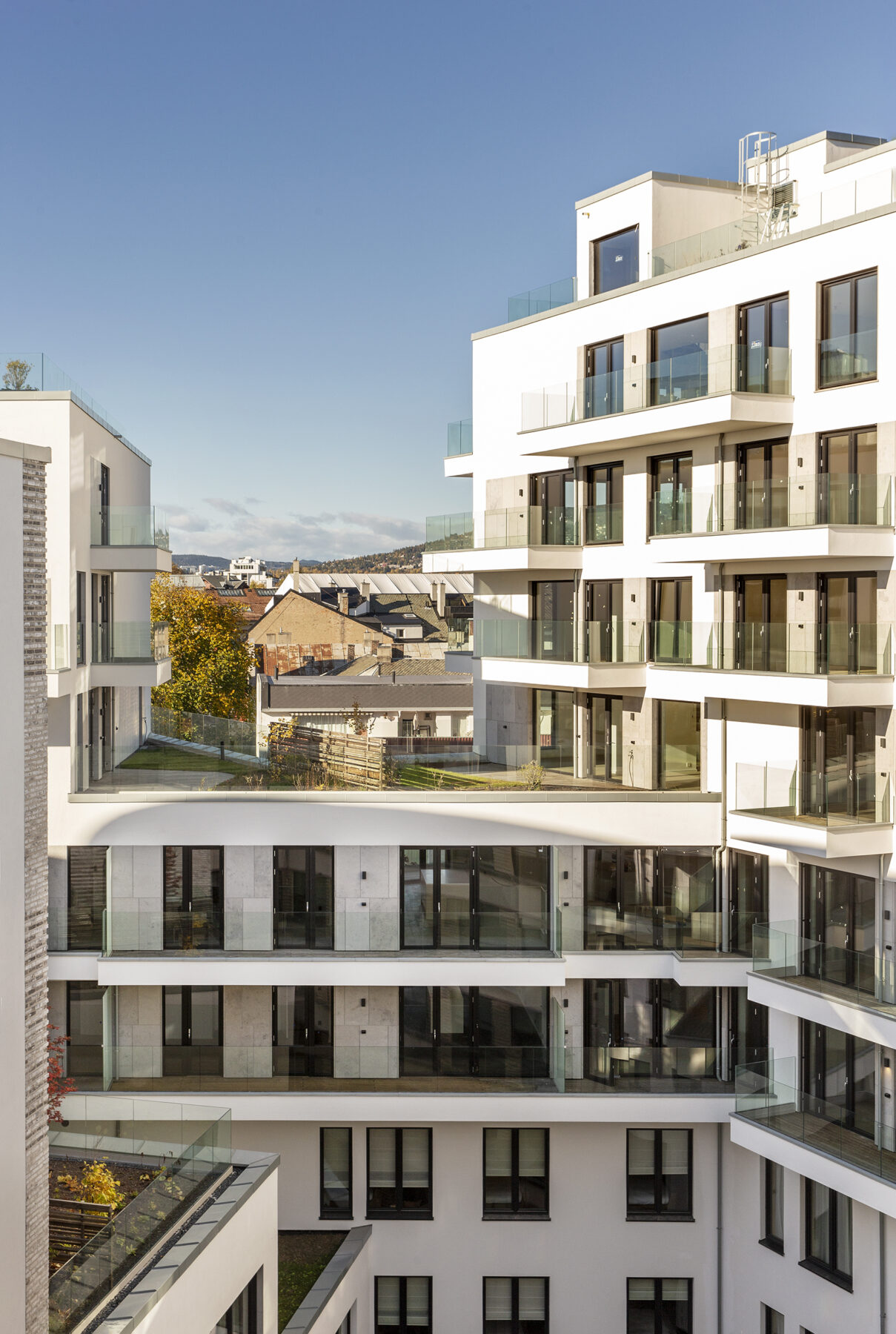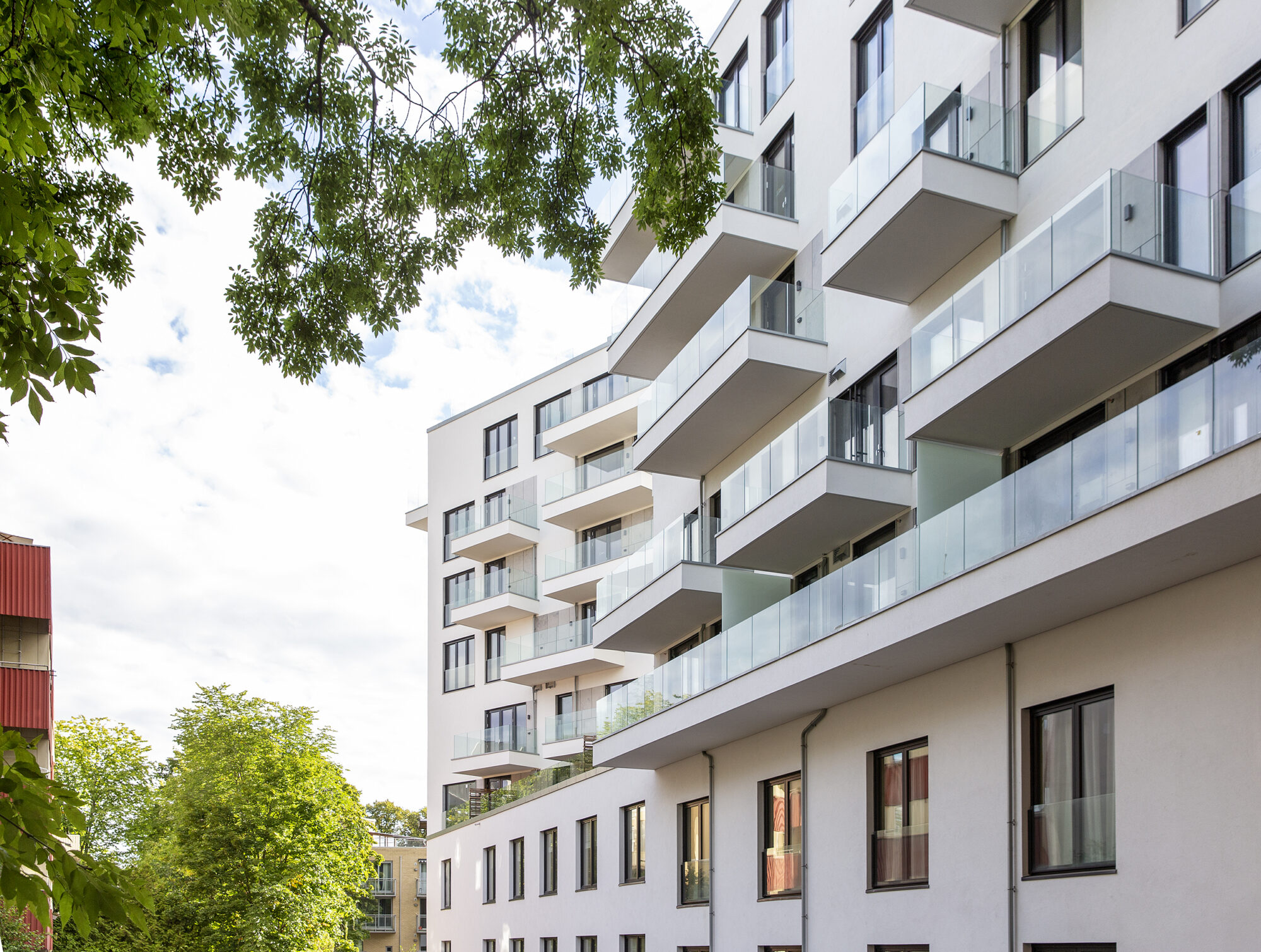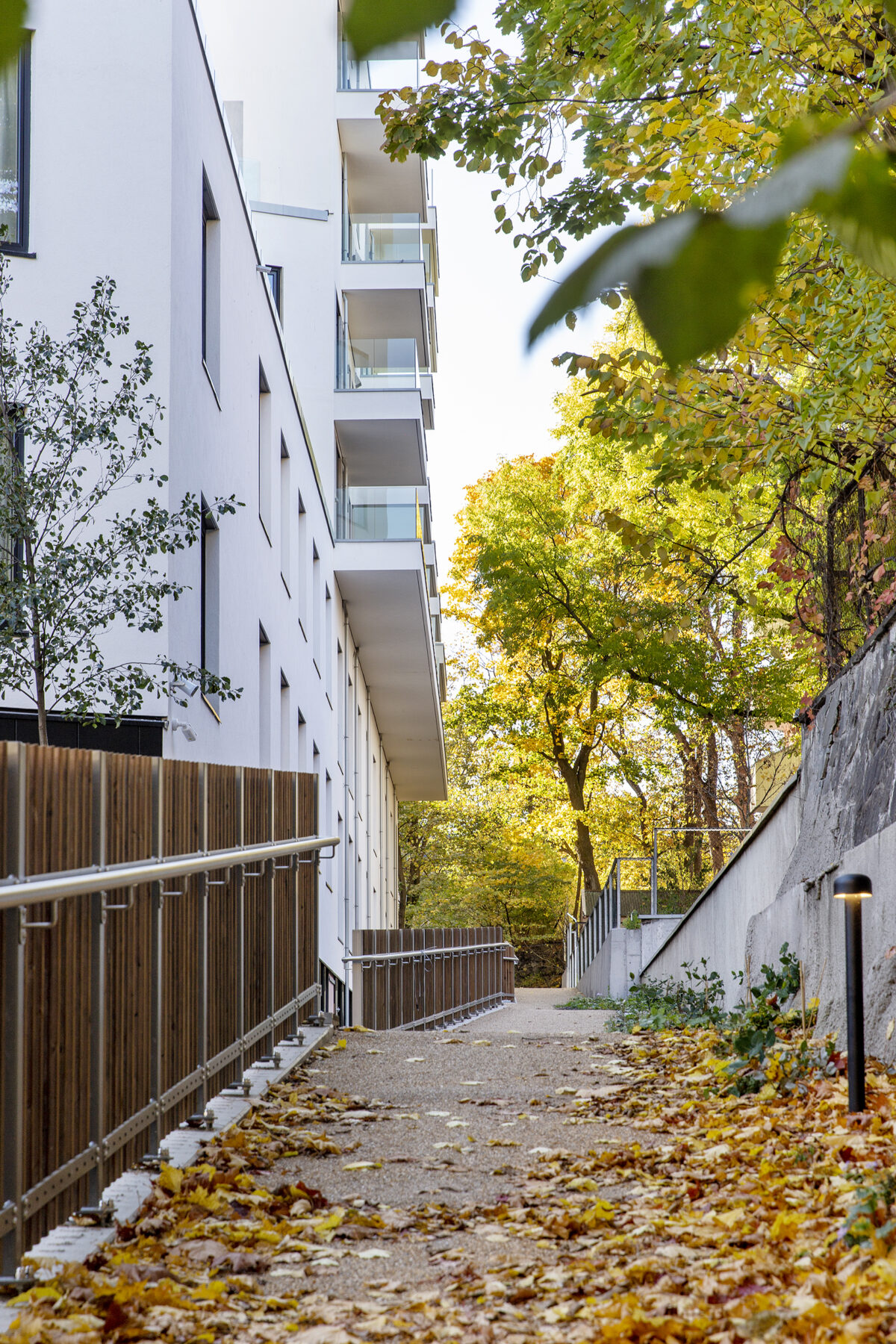 Selv om leilighetsbygget har moderne og tidsriktige kvaliteter som store vindusflater og luftige balkonger, har ideen vært å få til et tidløst og rolig fasadeutrykk. I tillegg er det benyttet mye naturstein i fasaden for å understreke at leilighetsbygget har en relasjon til de eksisterende og vernede bygningsmassene i forkant.