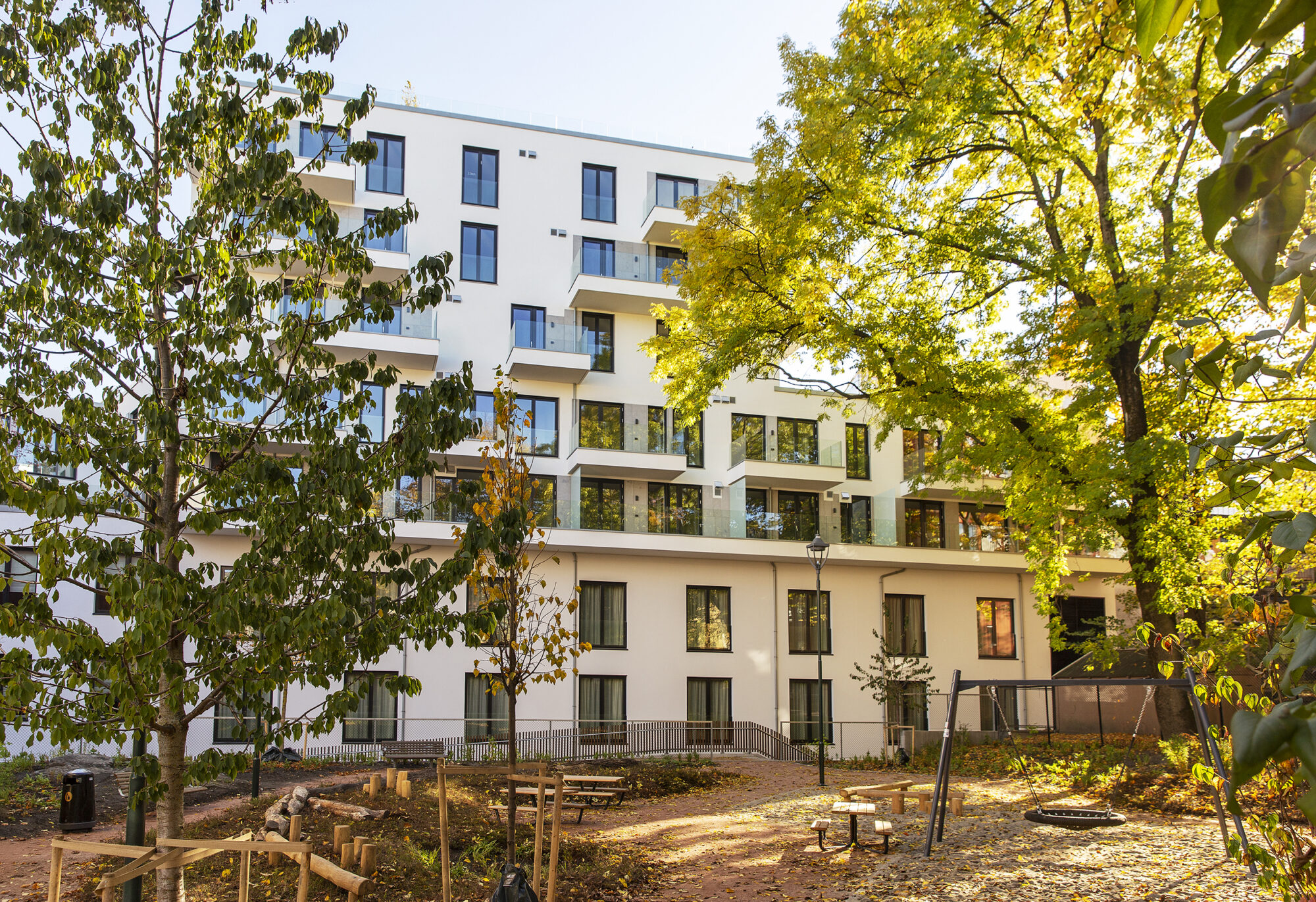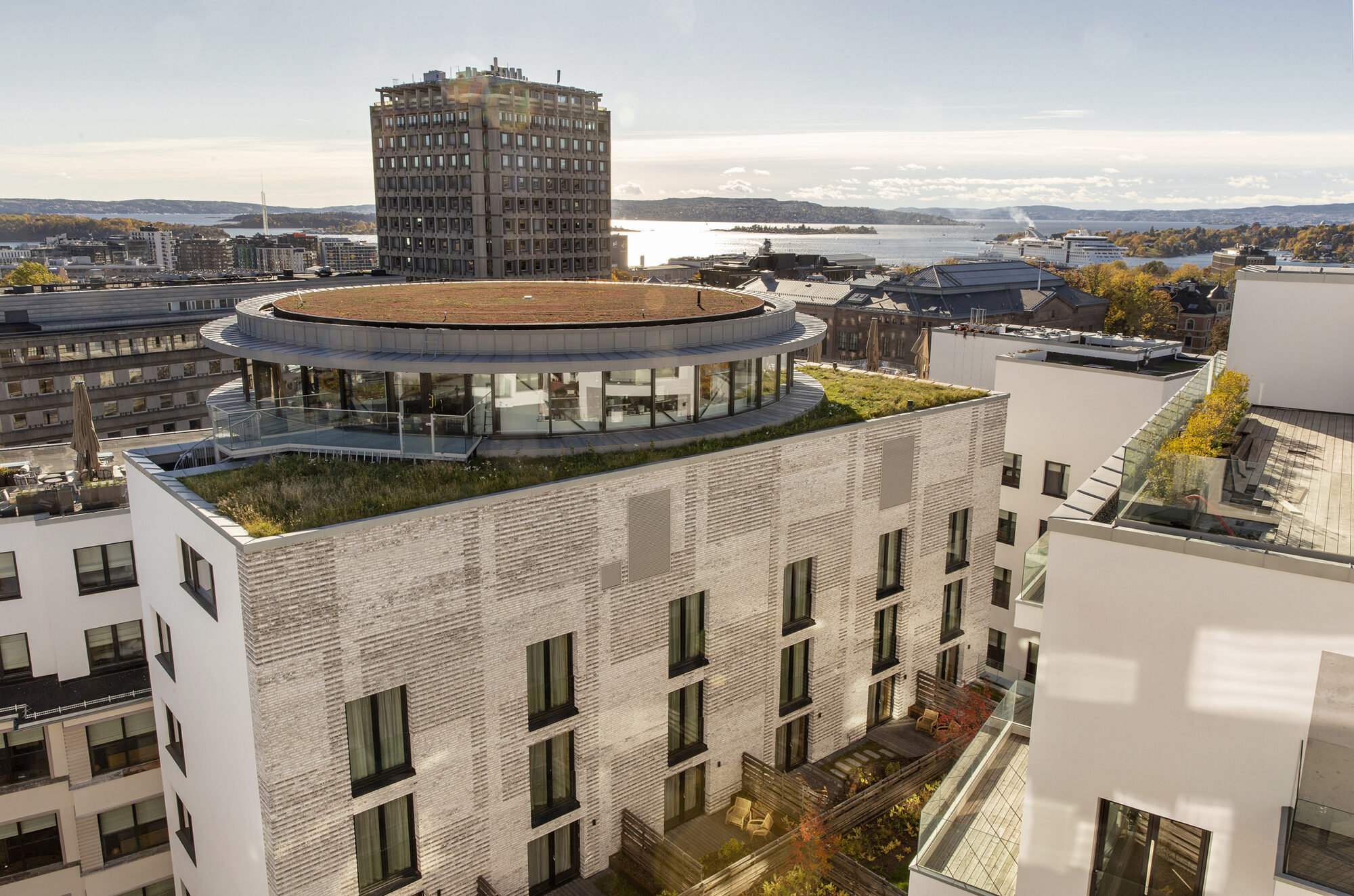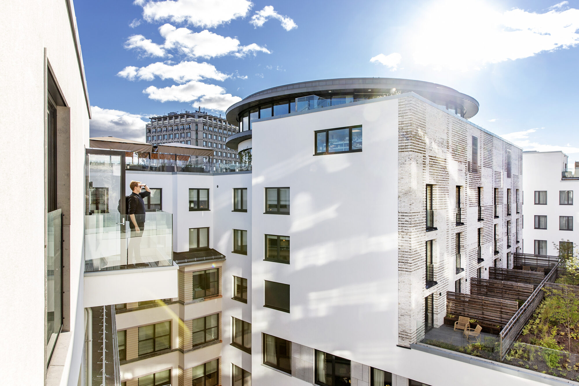 Selv om leilighetsbygget har moderne og tidsriktige kvaliteter som store vindusflater og luftige balkonger, har ideen vært å få til et tidløst og rolig fasadeutrykk. I tillegg er det benyttet mye naturstein i fasaden for å understreke at leilighetsbygget har en relasjon til de eksisterende og vernede bygningsmassene i forkant.