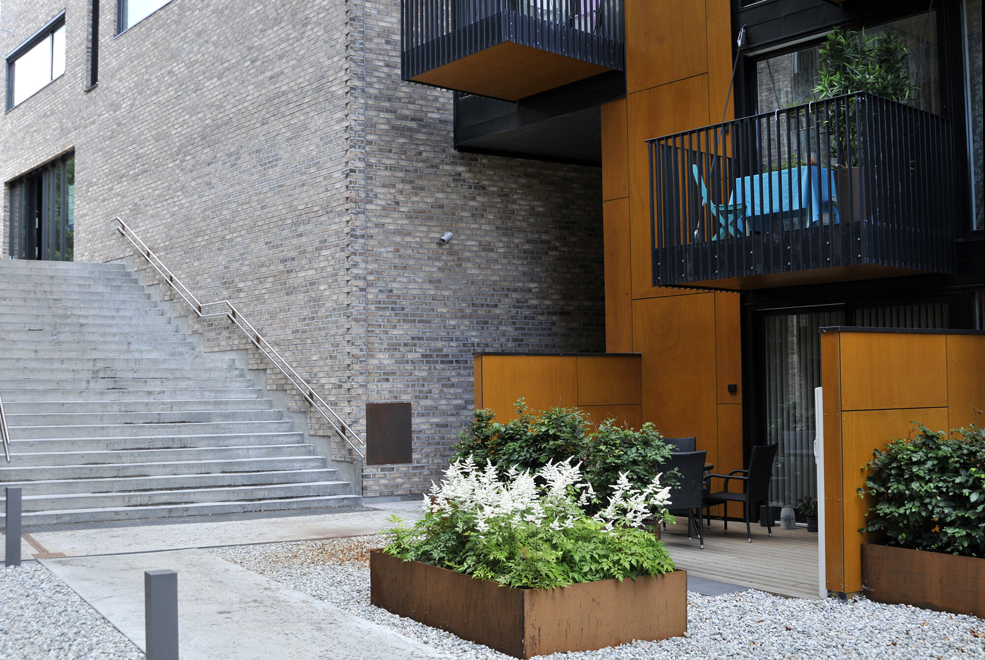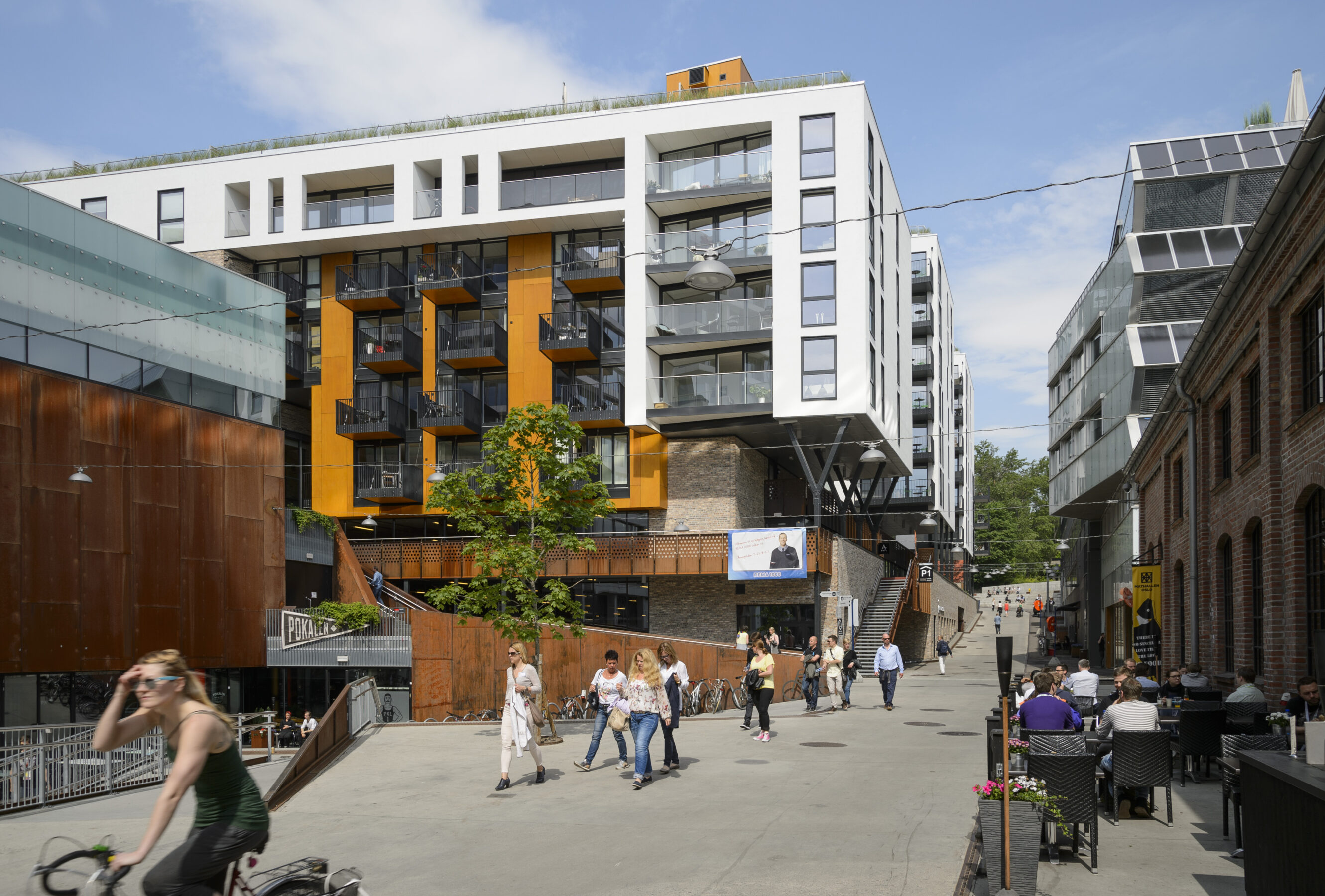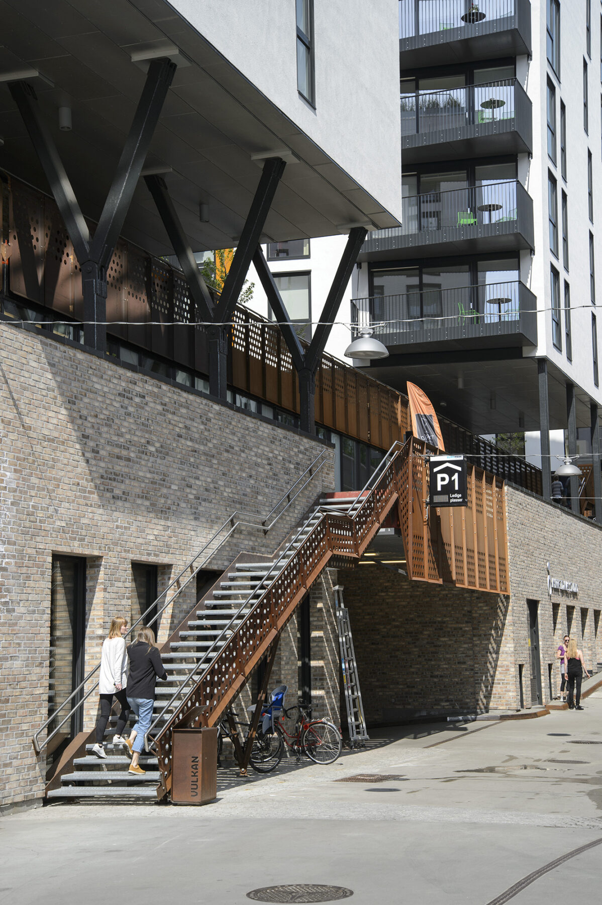 Mellom byggets hovedvolumer dannes et vev av mindre offentlige uterom, terrasser og ganglinjer. Prosjektet kobles til og kompletterer slik vulkanområdets byvev. Hovedmaterialet i tegl knytter også Nordre kvartal til de gamle broverkstedene og industribebyggelsen langs Maridalsveien. De fire boligvolumene rommer 117 leiligheter, med størrelser fra 40 til 150 kvadratmeter. På takene finnes felles- og private hager. Mot Maridalsveien ligger et butikksenter på 3500 kvadratmeter med forretning og servering. Etasjene over rommer kontorarealer på 1500 kvadratmeter.