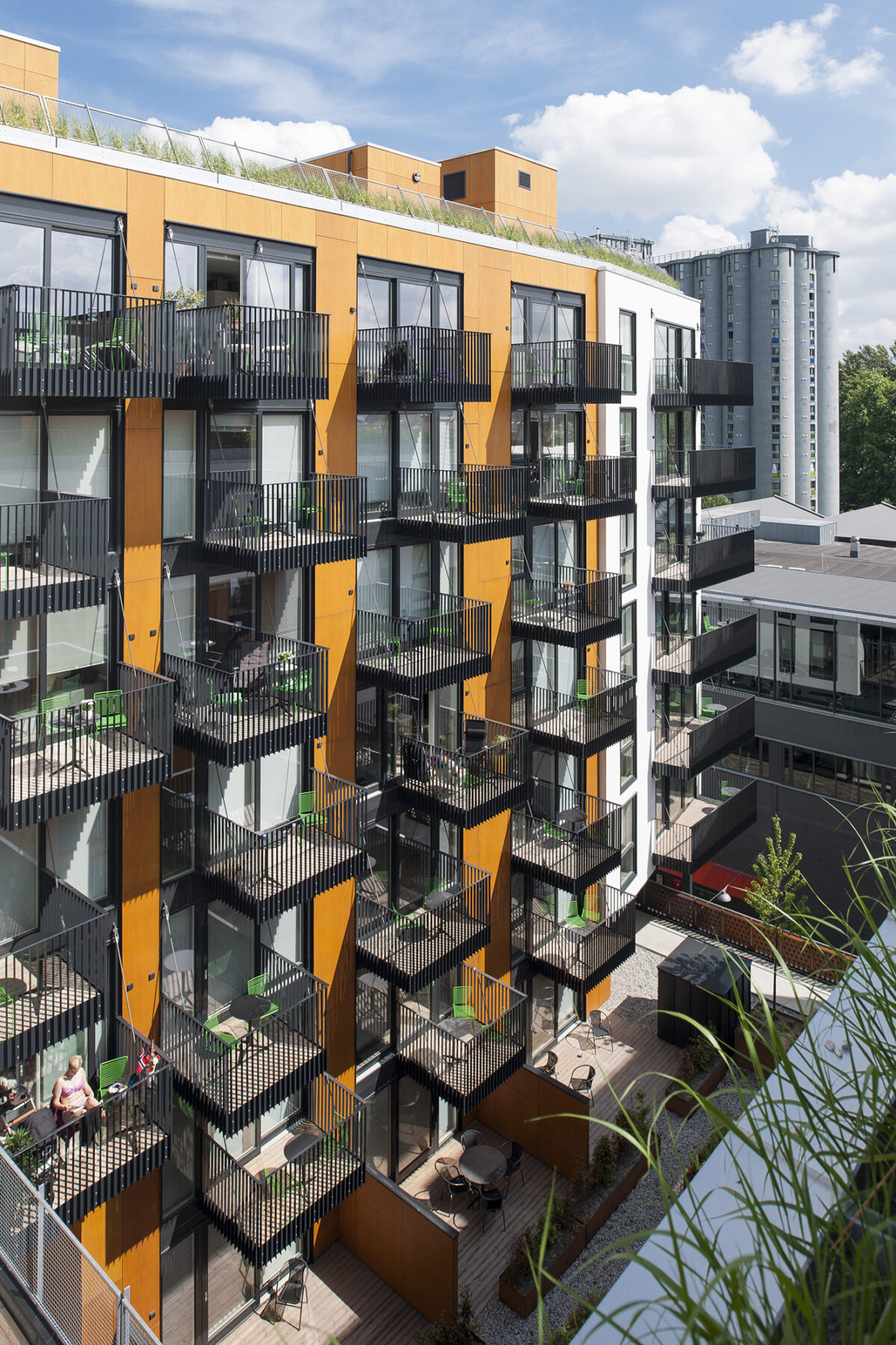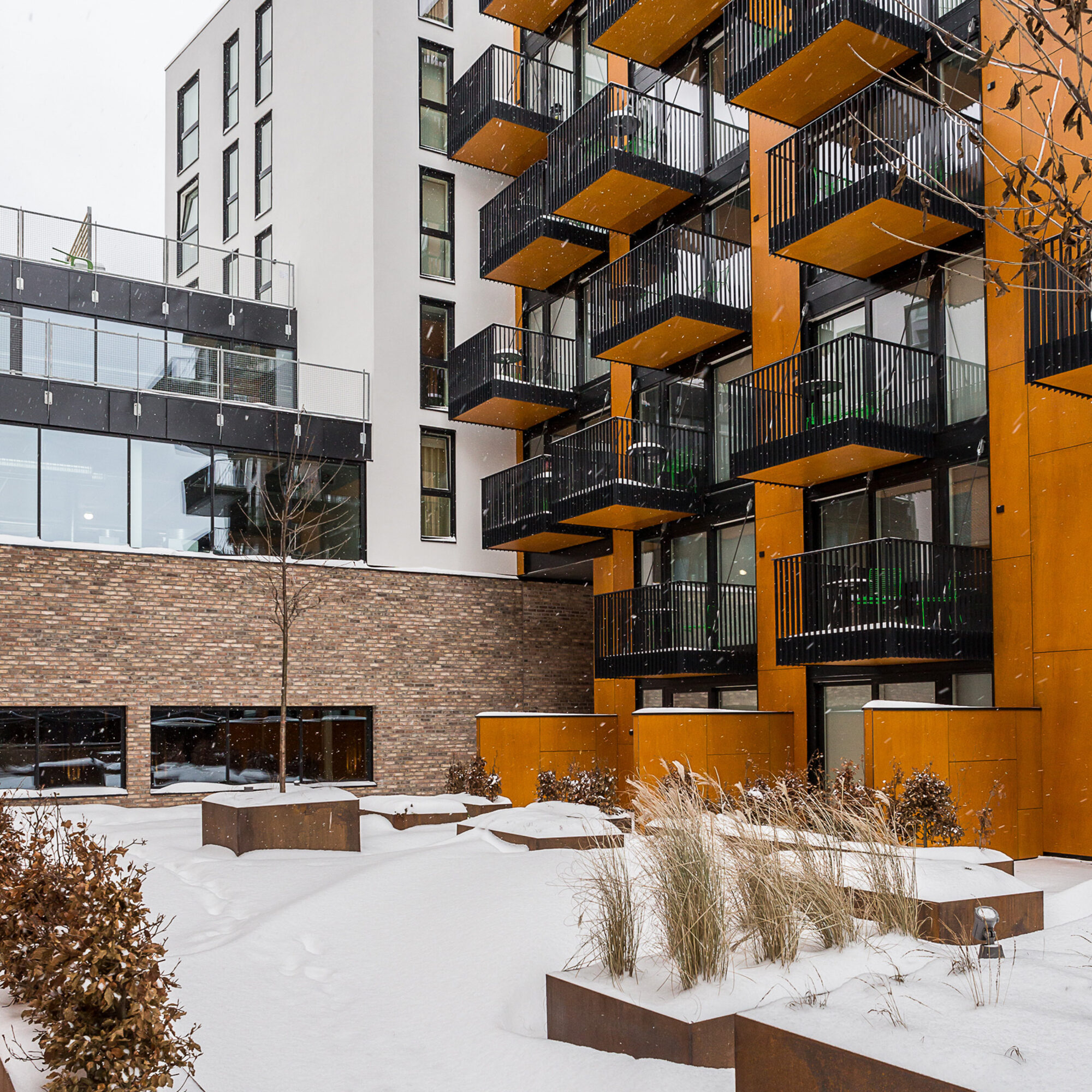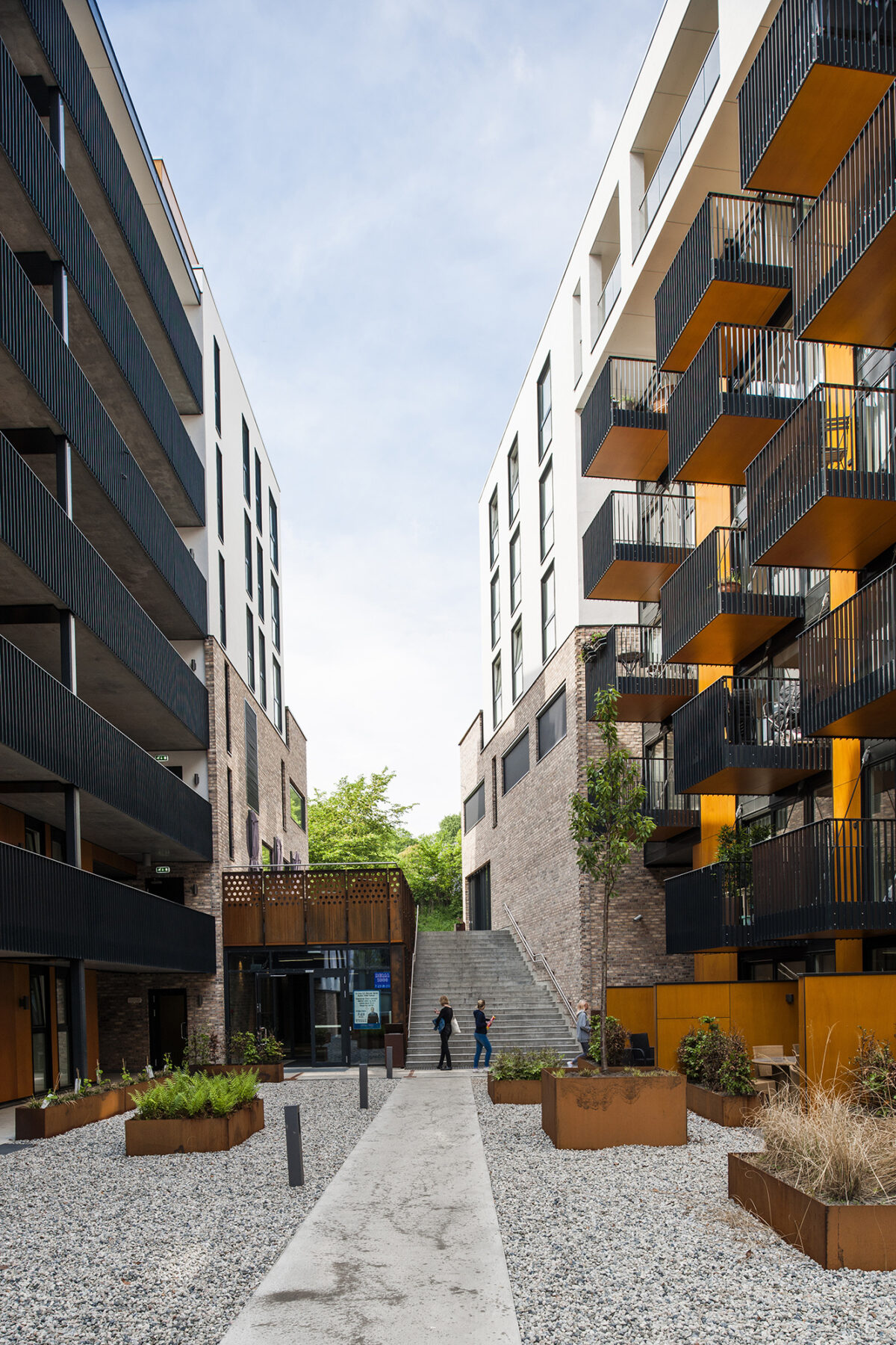 Mellom byggets hovedvolumer dannes et vev av mindre offentlige uterom, terrasser og ganglinjer. Prosjektet kobles til og kompletterer slik vulkanområdets byvev. Hovedmaterialet i tegl knytter også Nordre kvartal til de gamle broverkstedene og industribebyggelsen langs Maridalsveien. De fire boligvolumene rommer 117 leiligheter, med størrelser fra 40 til 150 kvadratmeter. På takene finnes felles- og private hager. Mot Maridalsveien ligger et butikksenter på 3500 kvadratmeter med forretning og servering. Etasjene over rommer kontorarealer på 1500 kvadratmeter.